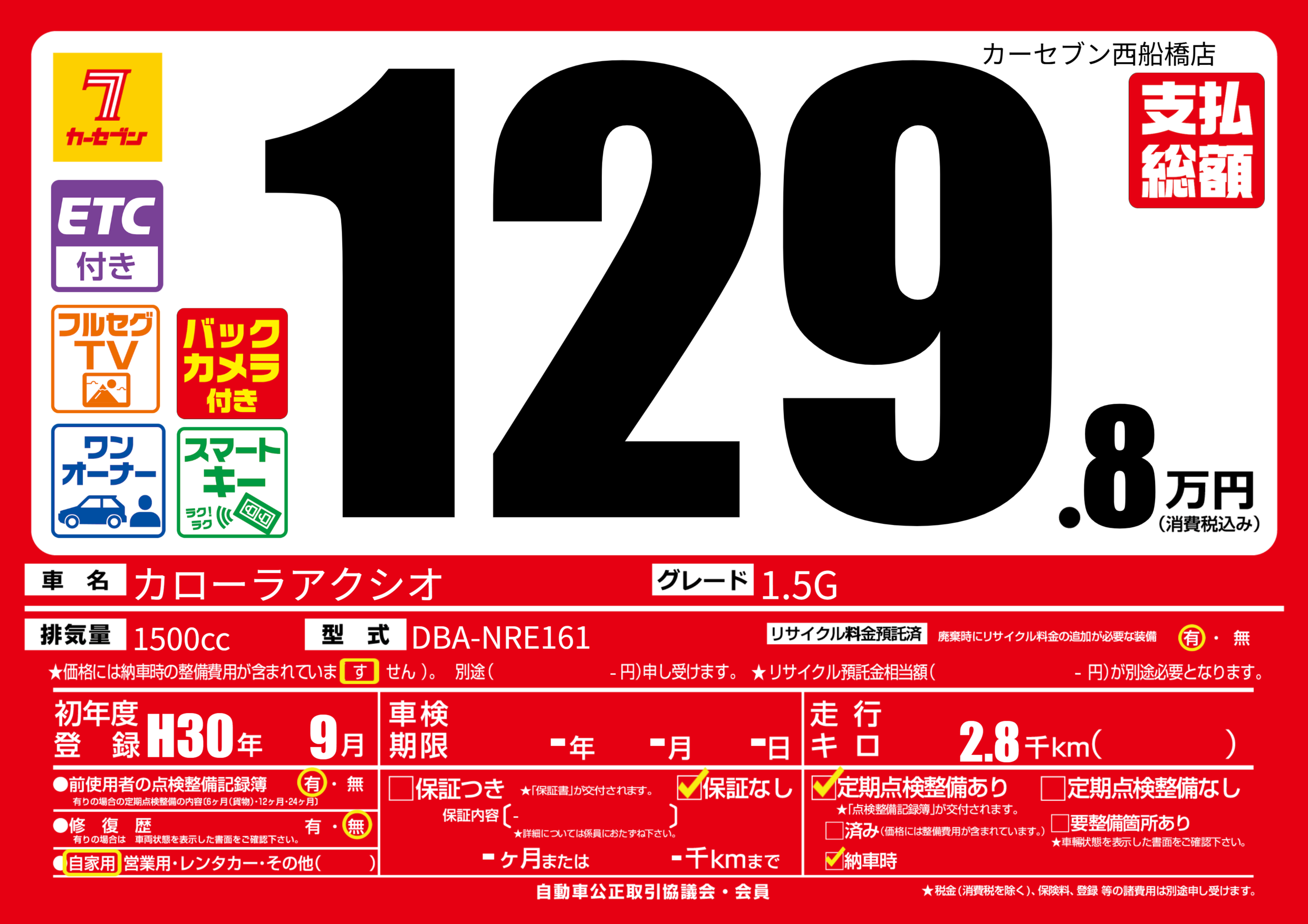 | 定期点検整備 | 定期点検整備あり 納車時あり | ||