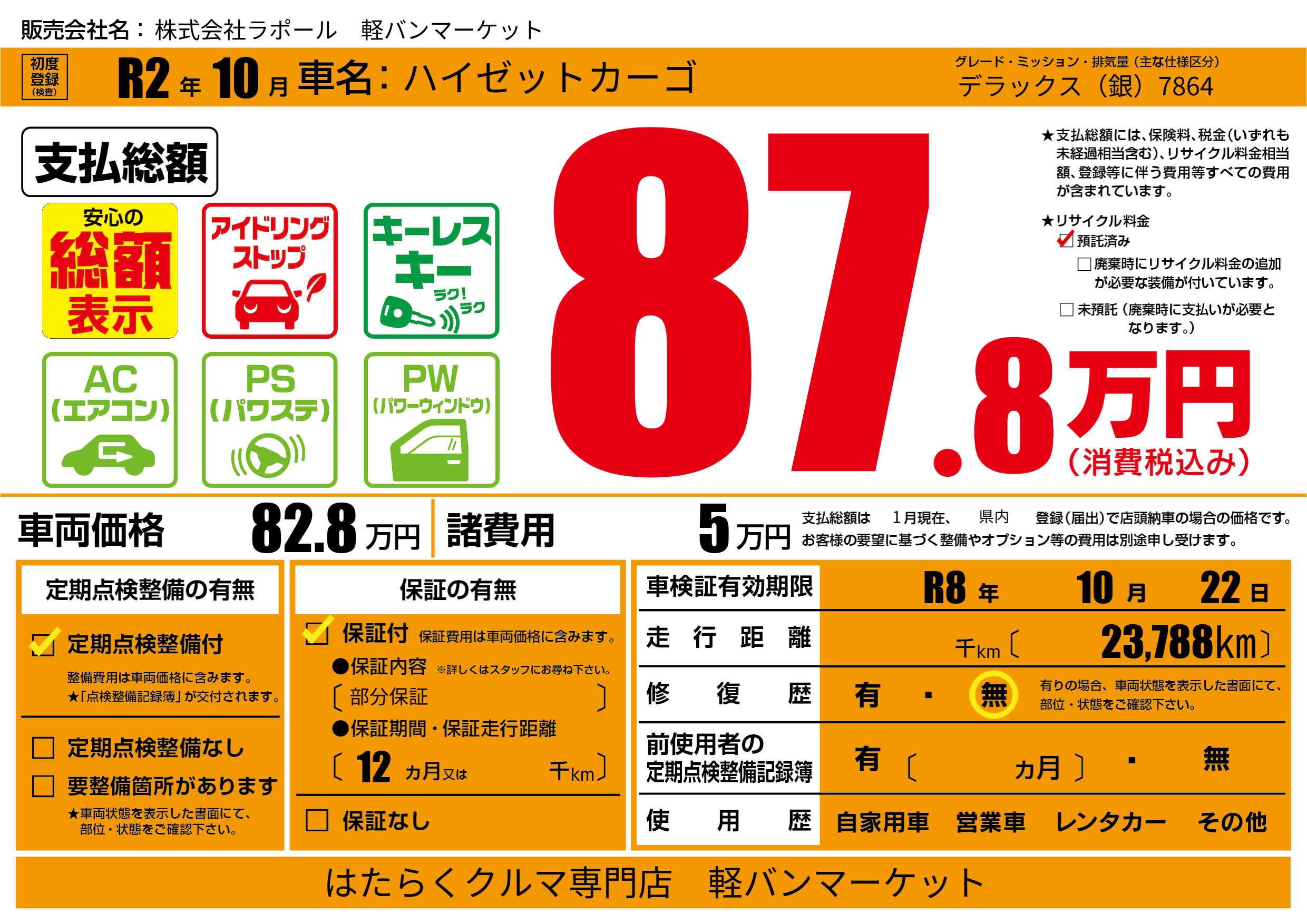なし | 車検制限 | R8年10月22月 |