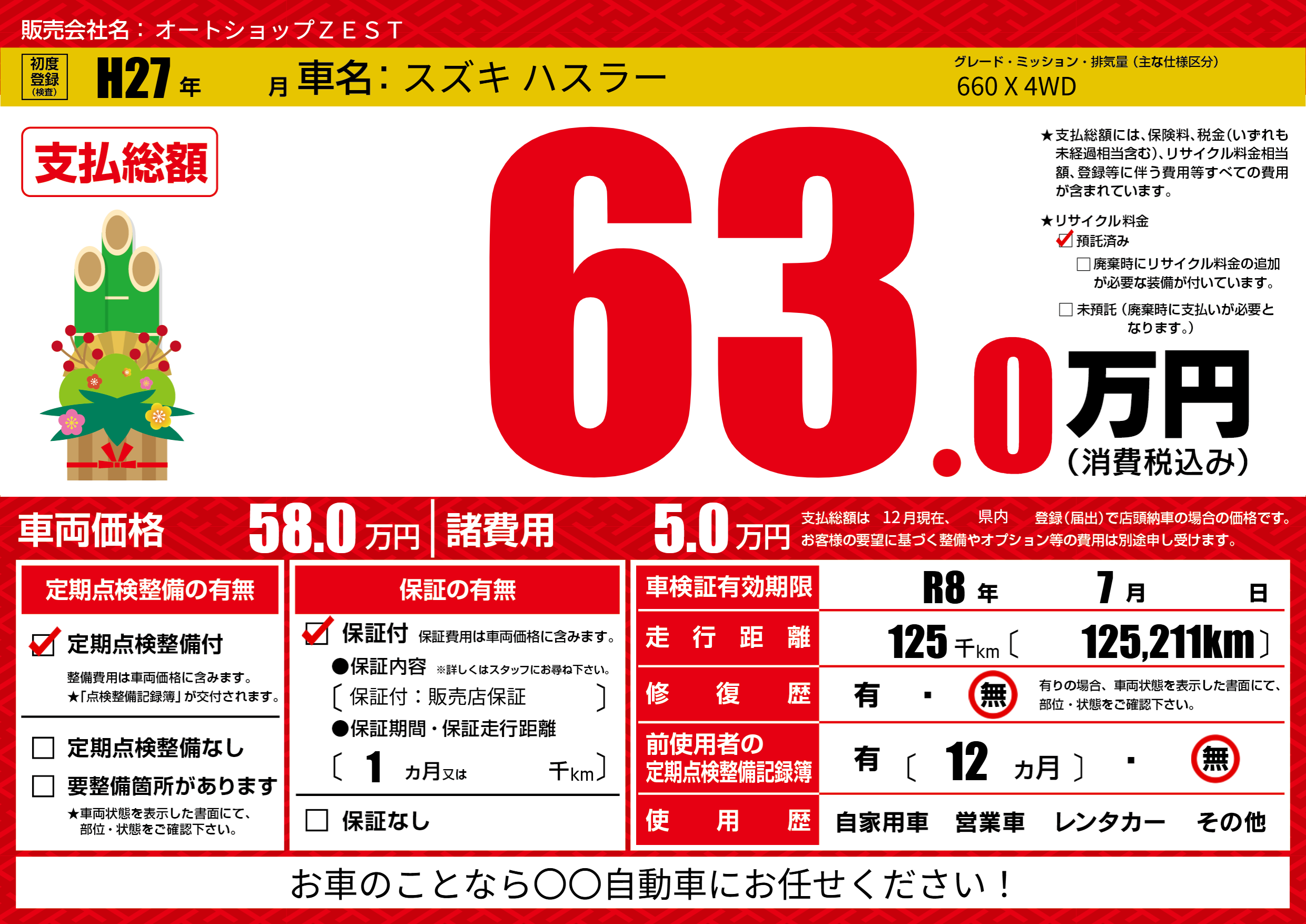 | 車名 | スズキ ハスラー | グレード ミッション 排気量 |