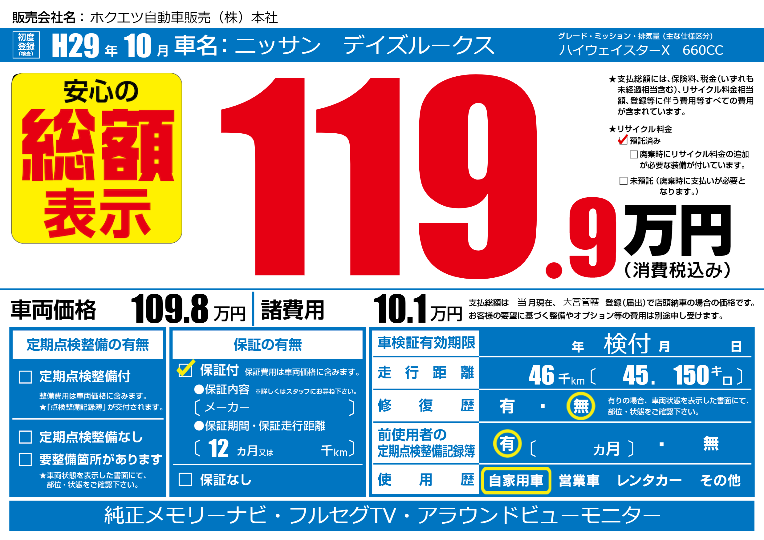 | 車名 | ニッサン デイズルークス | グレード ミッション 排気量 |