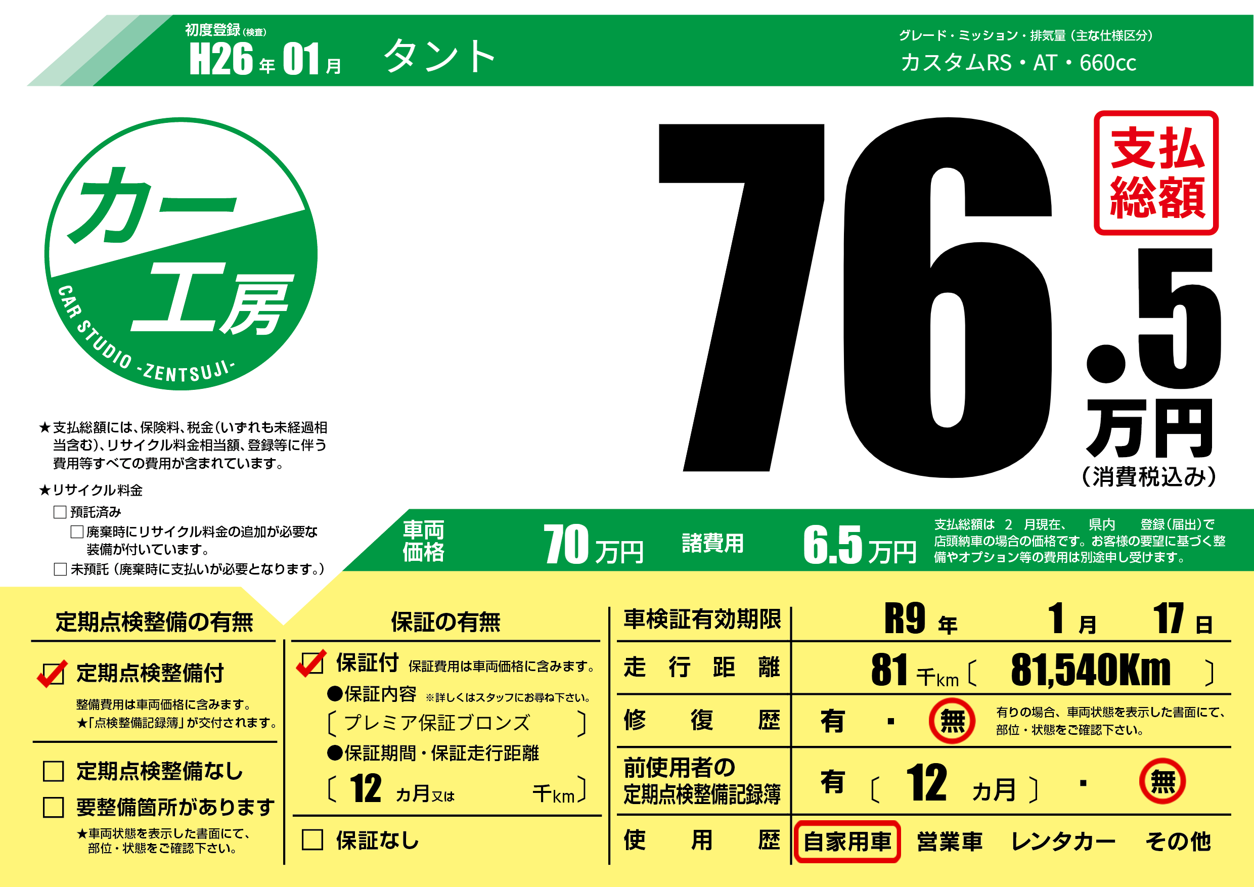 | 走行キロ | 8.1万km | 初年度登録 | H26年01月 |