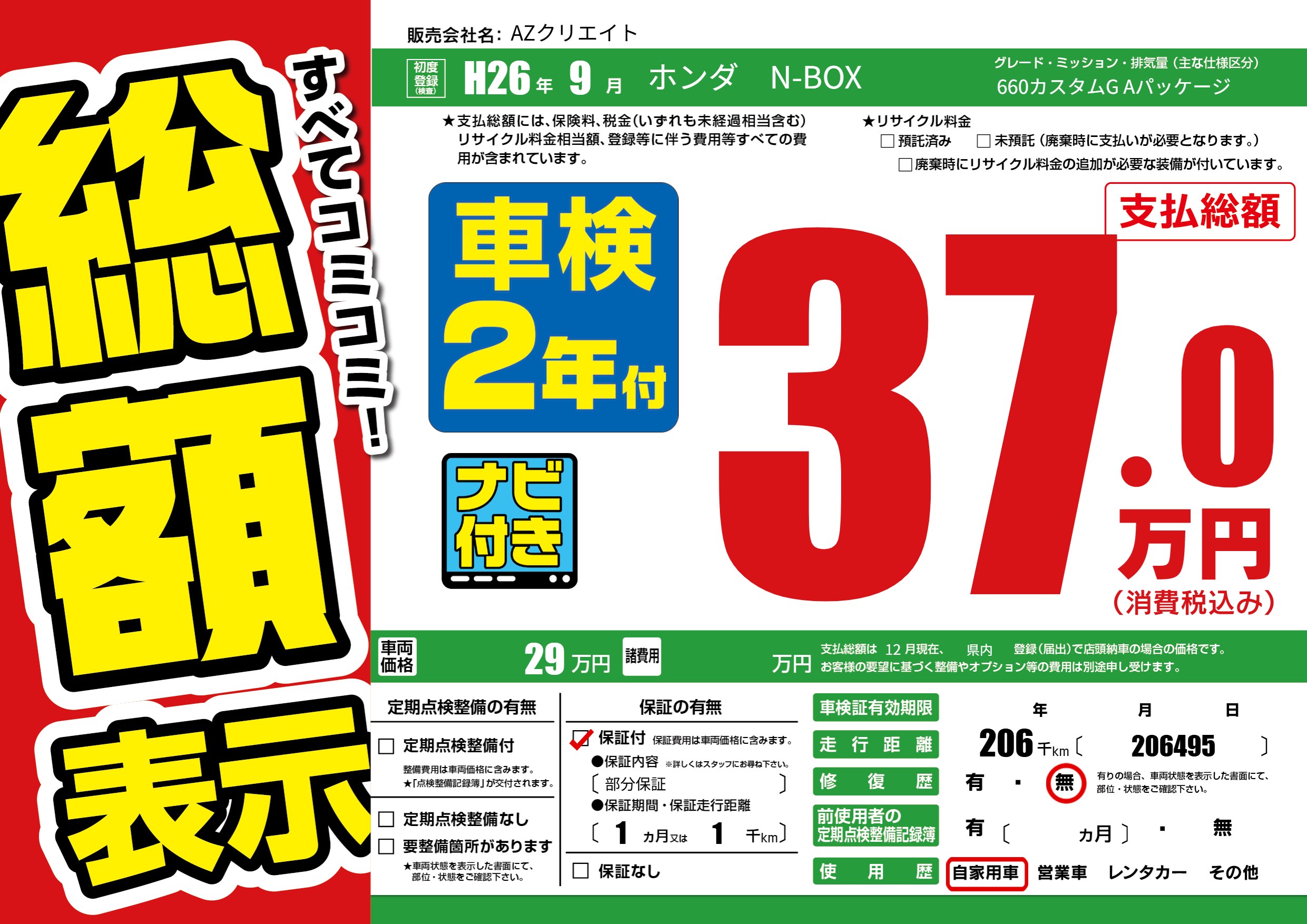 | 走行キロ | 20.6万km | 初年度登録 | H26年9月 |