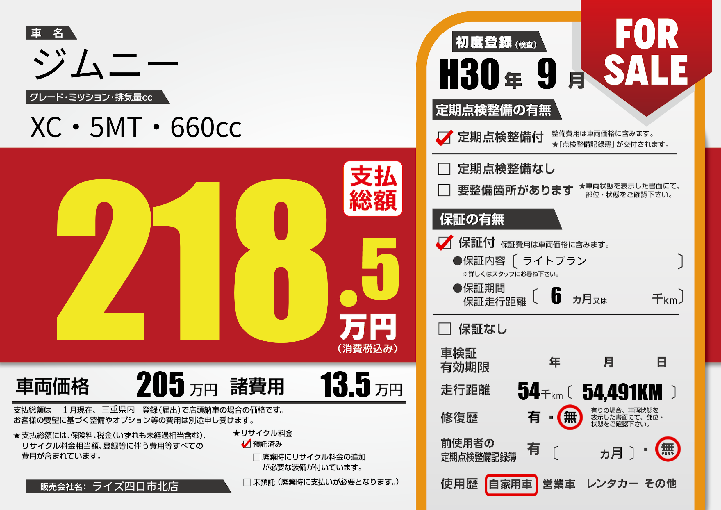 | 走行キロ | 5.4万km | 初年度登録 | H30年9月 |