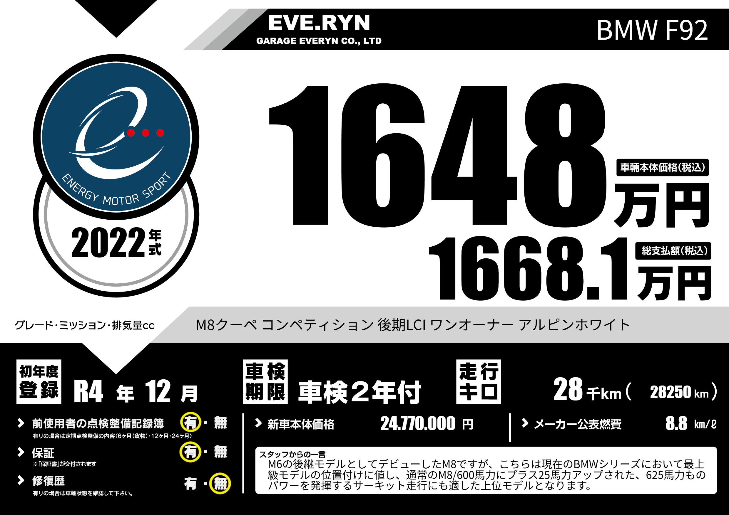 | 車名 | BMW F92 | グレード ミッション 排気量 |
