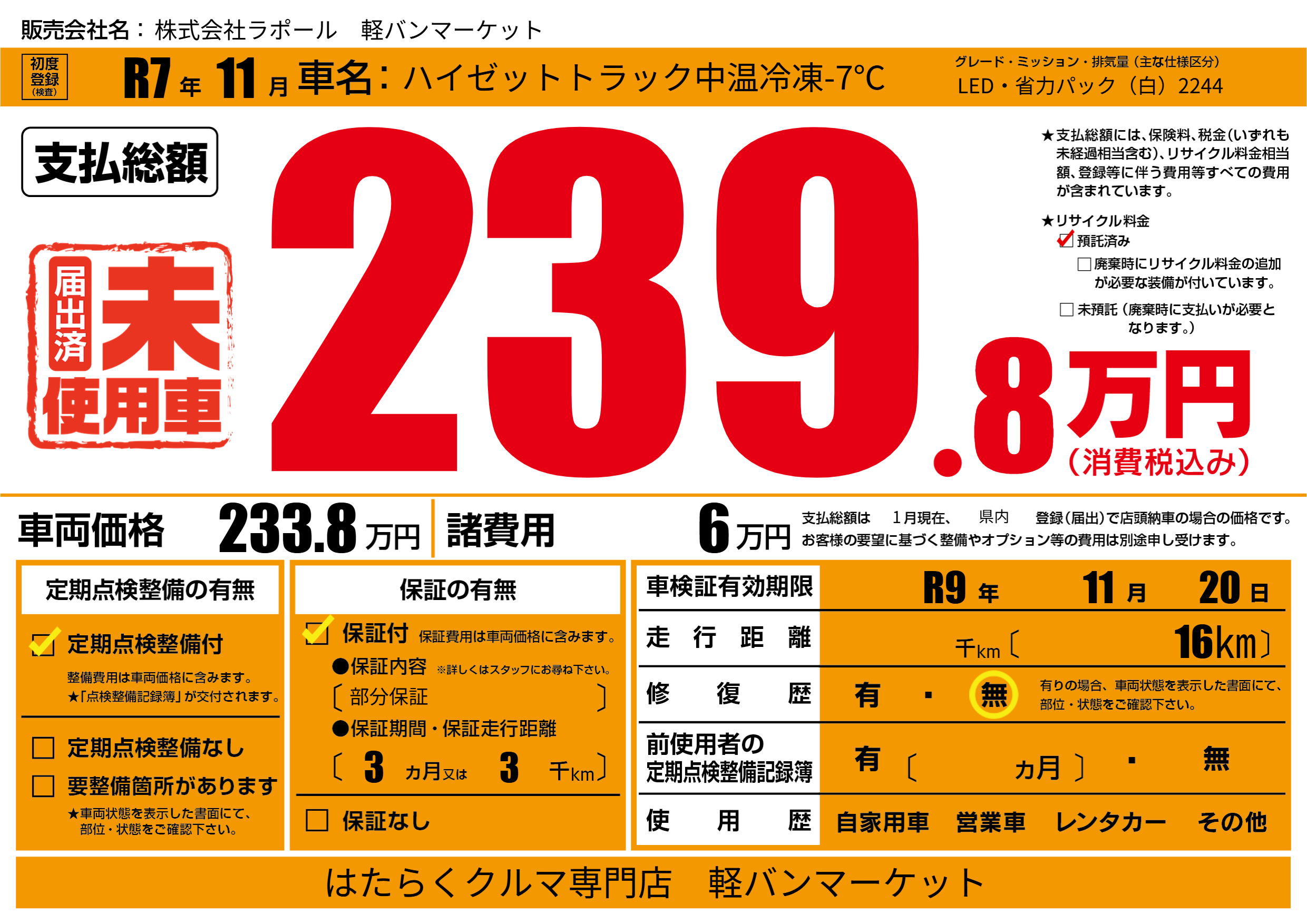 | 車名 | ハイゼットトラック中温冷凍-7℃ | グレード ミッション 排気量 |