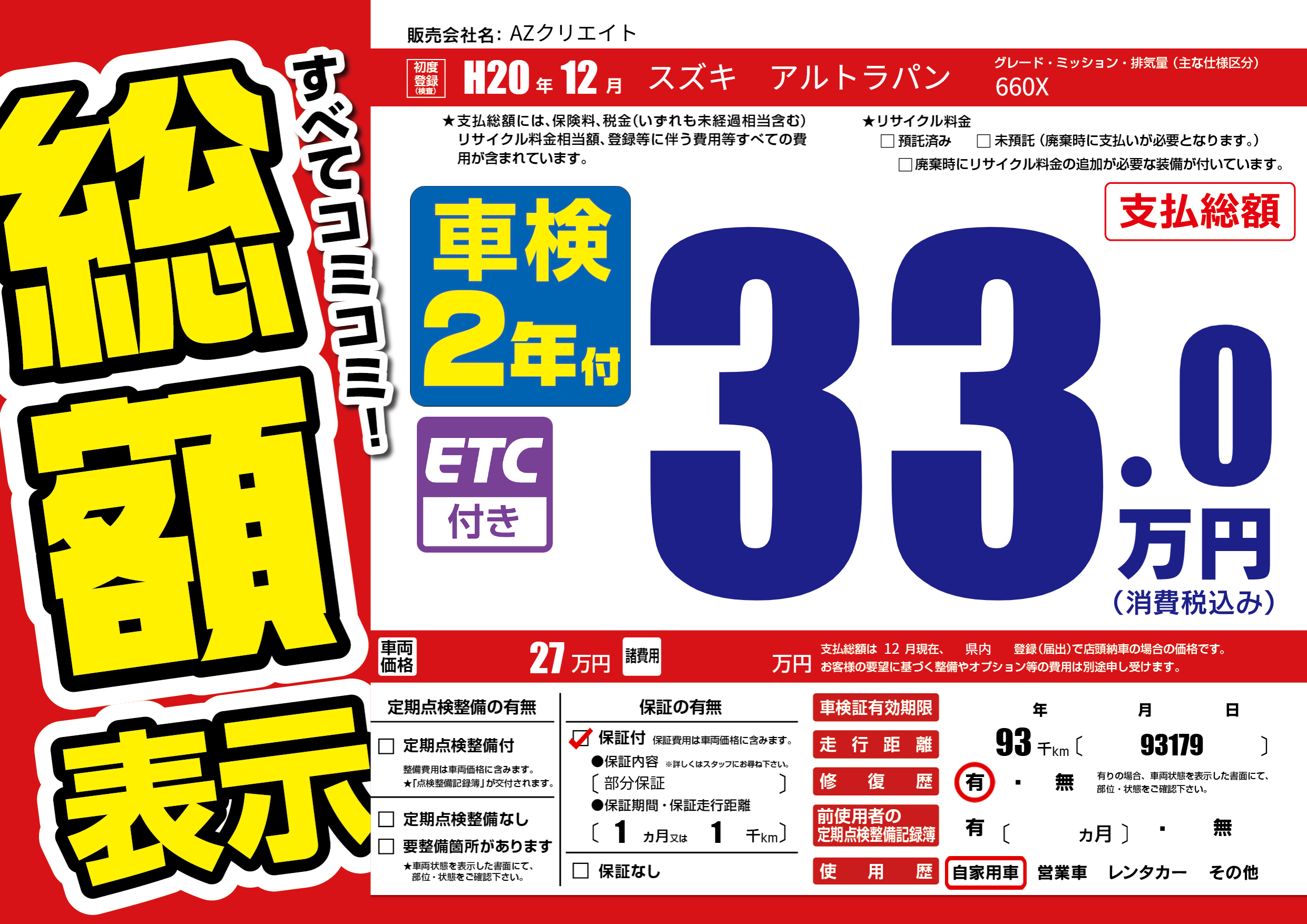 | 走行キロ | 9.3万km | 初年度登録 | H20年12月 |