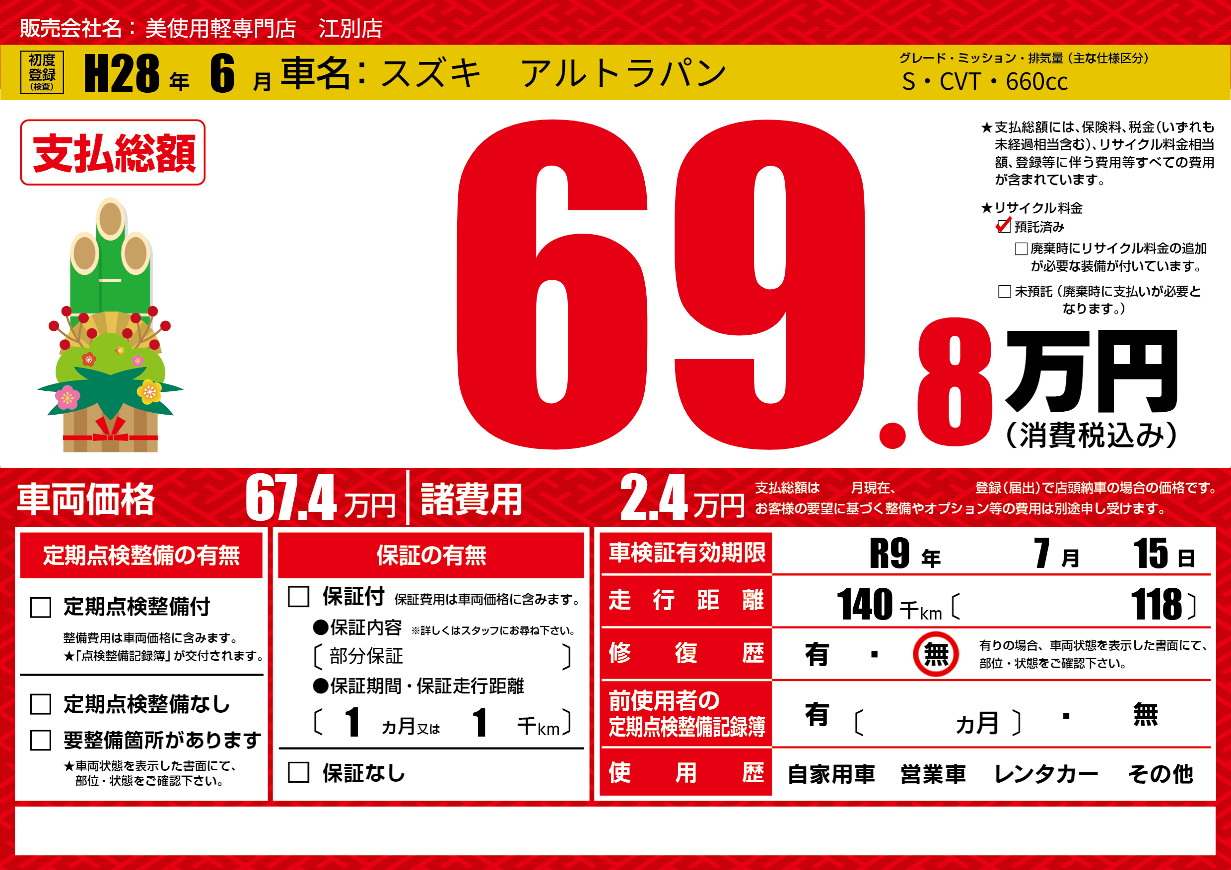あり | リサイクル預託金相当額 | ( 0円)が別途必要 |