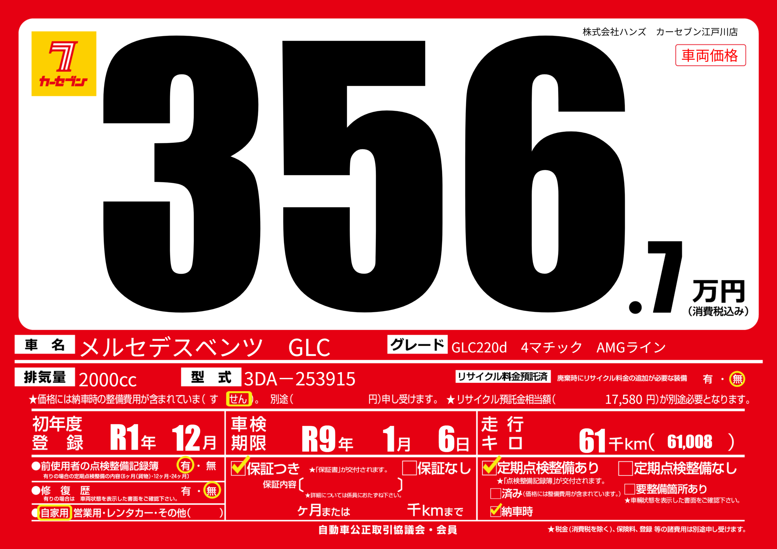 | 車名 | メルセデスベンツ GLC | グレード ミッション 排気量 |