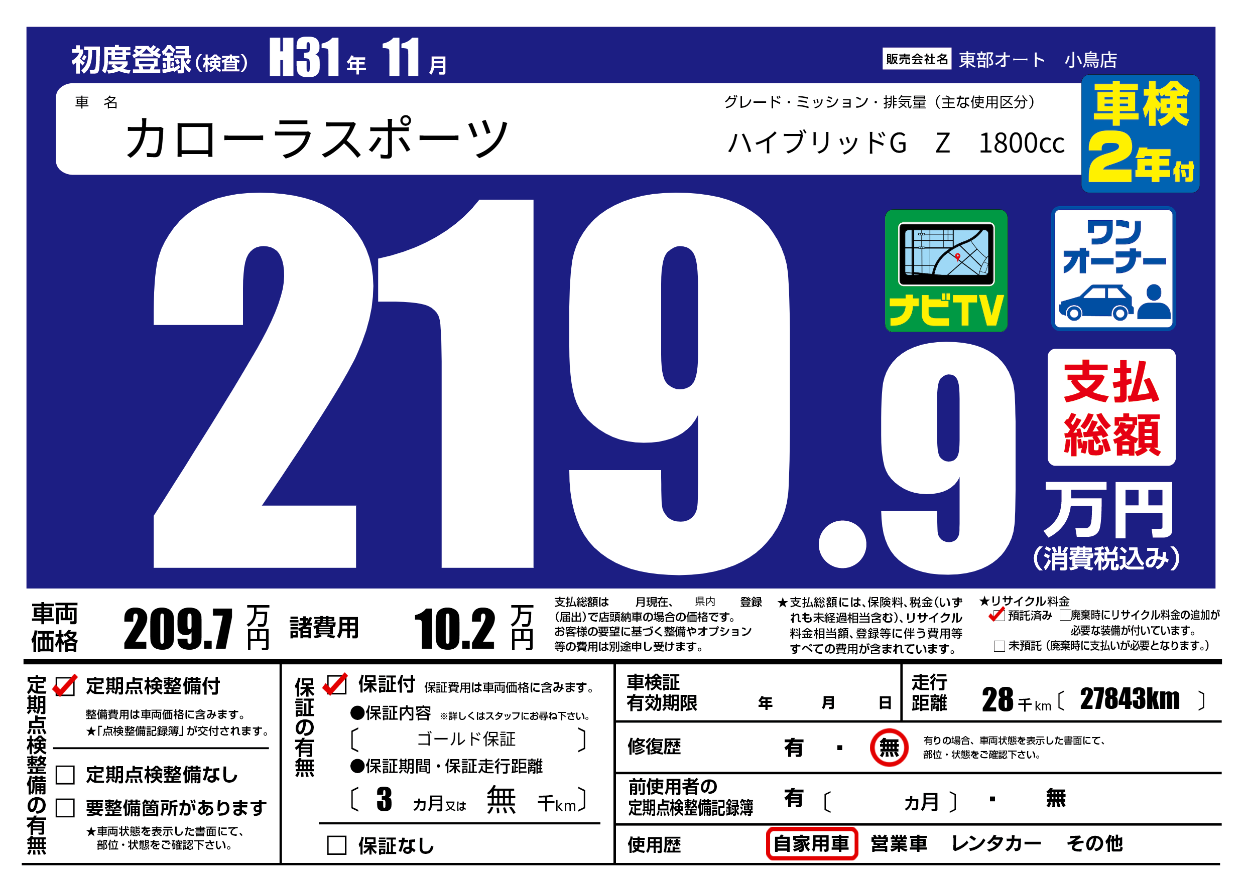 | 走行キロ | 2.8万km | 初年度登録 | H31年11月 |