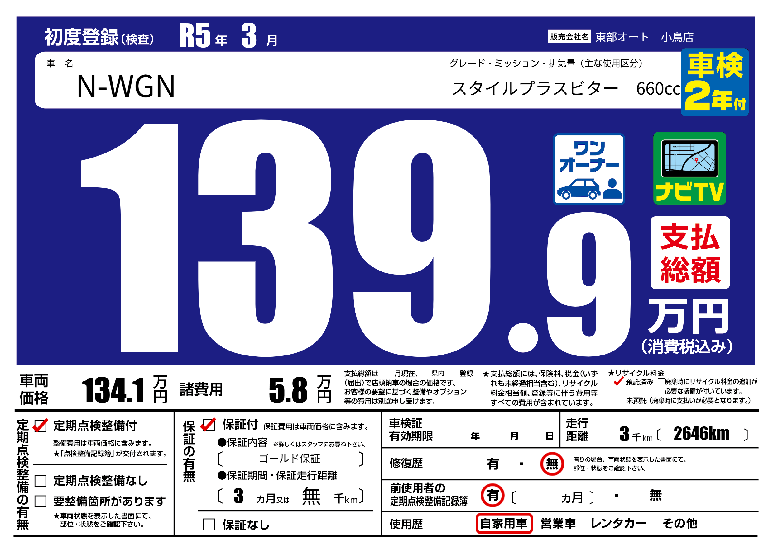 | 走行キロ | 0.3万km | 初年度登録 | R5年3月 |