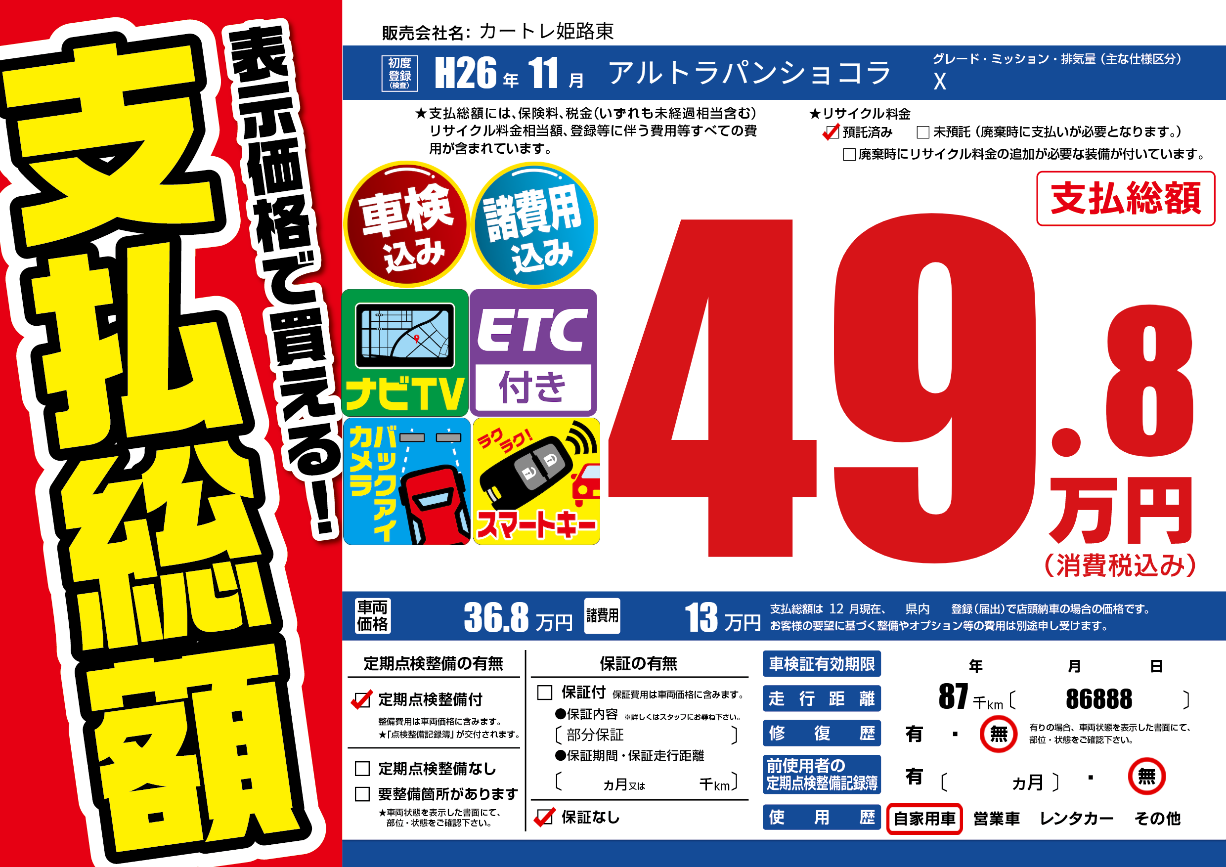 | 走行キロ | 8.7万km | 初年度登録 | H26年11月 |