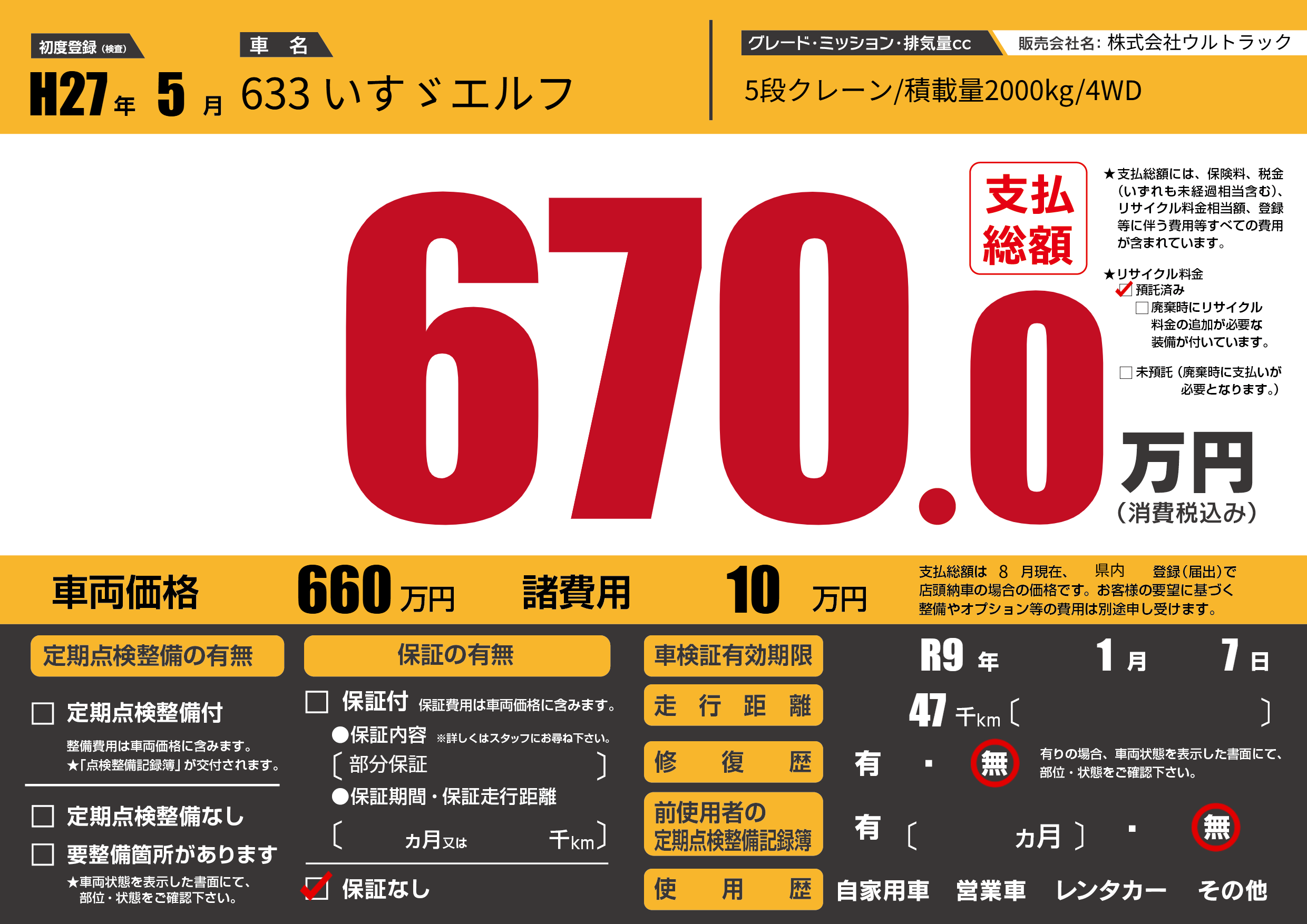 保証なし 保証内容(部分保証) ---ヶ月または()千kmまで |
