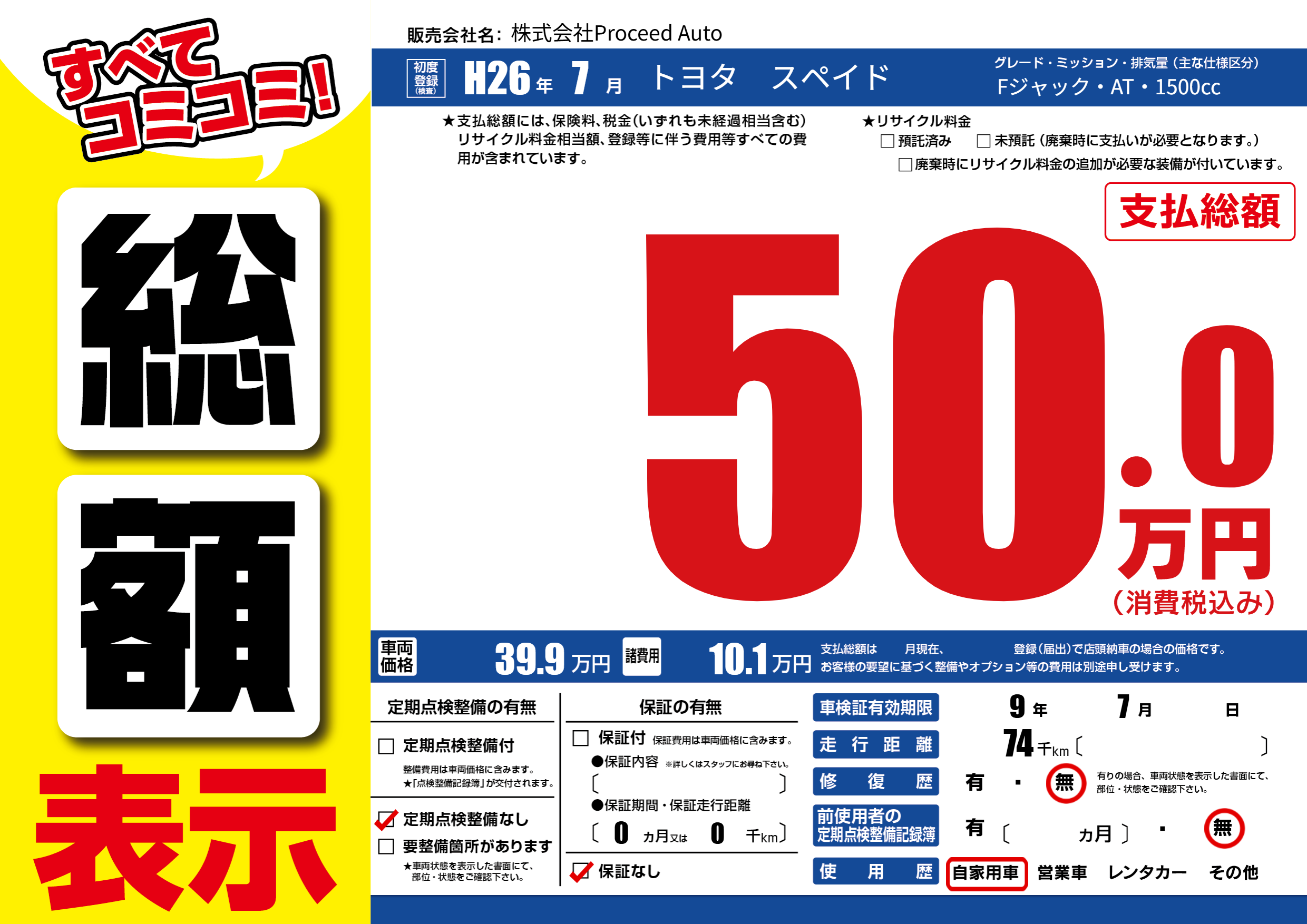 | 車名 | トヨタ スペイド | グレード ミッション 排気量 |