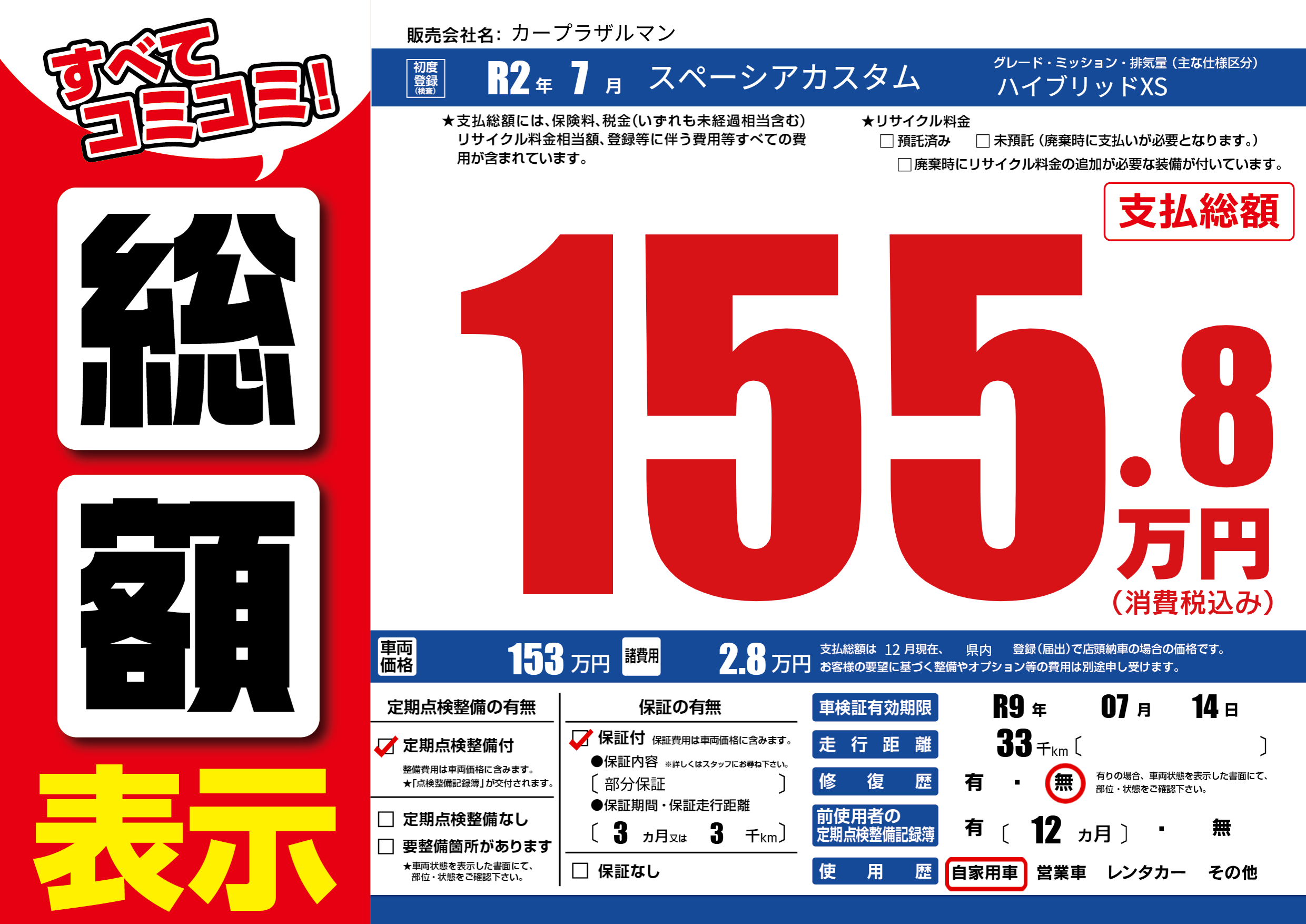| 車名 | スペーシアカスタム | グレード ミッション 排気量 |