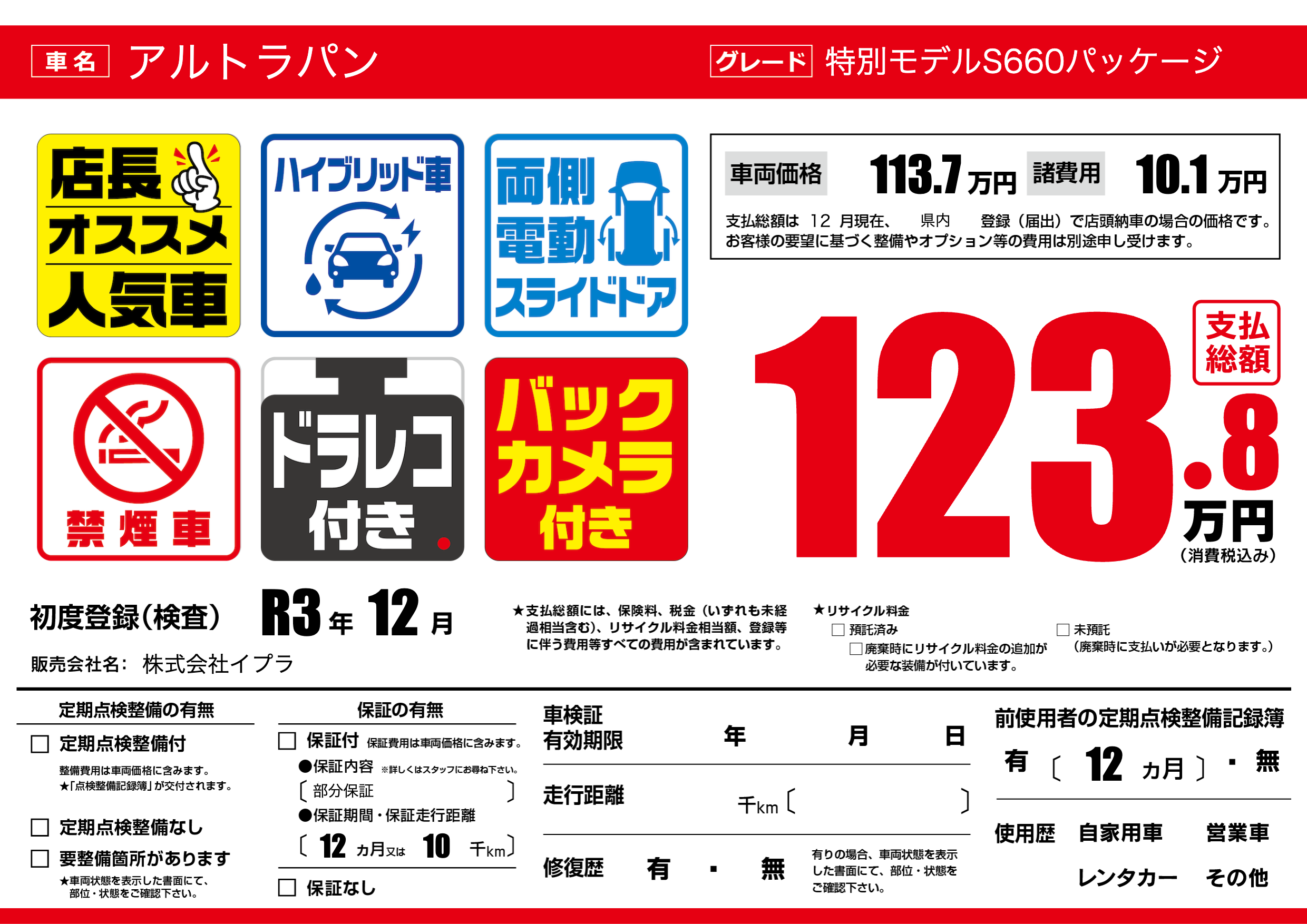| 走行キロ | - | 初年度登録 | R3年12月 |