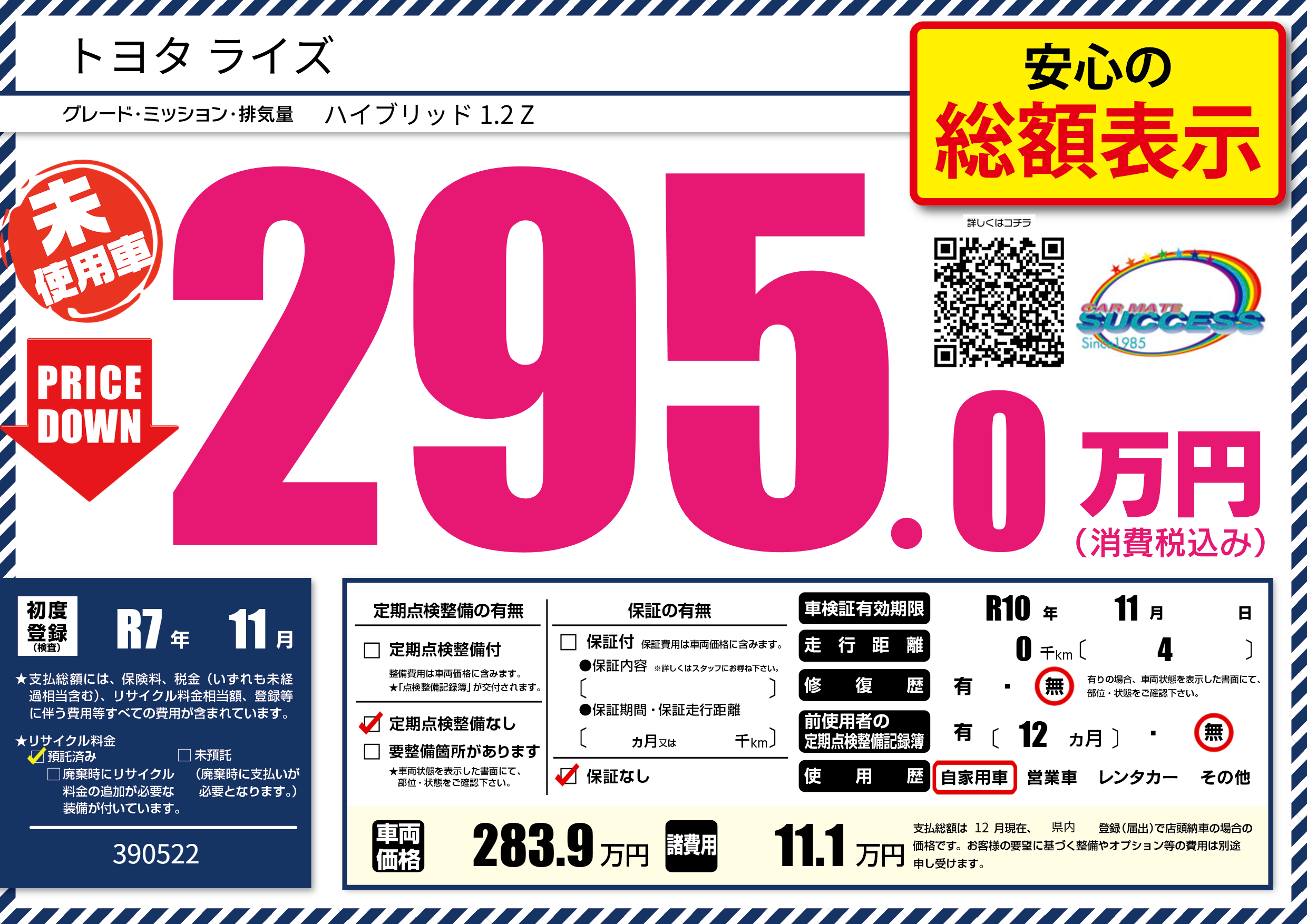 | 車名 | トヨタ ライズ | グレード ミッション 排気量 |