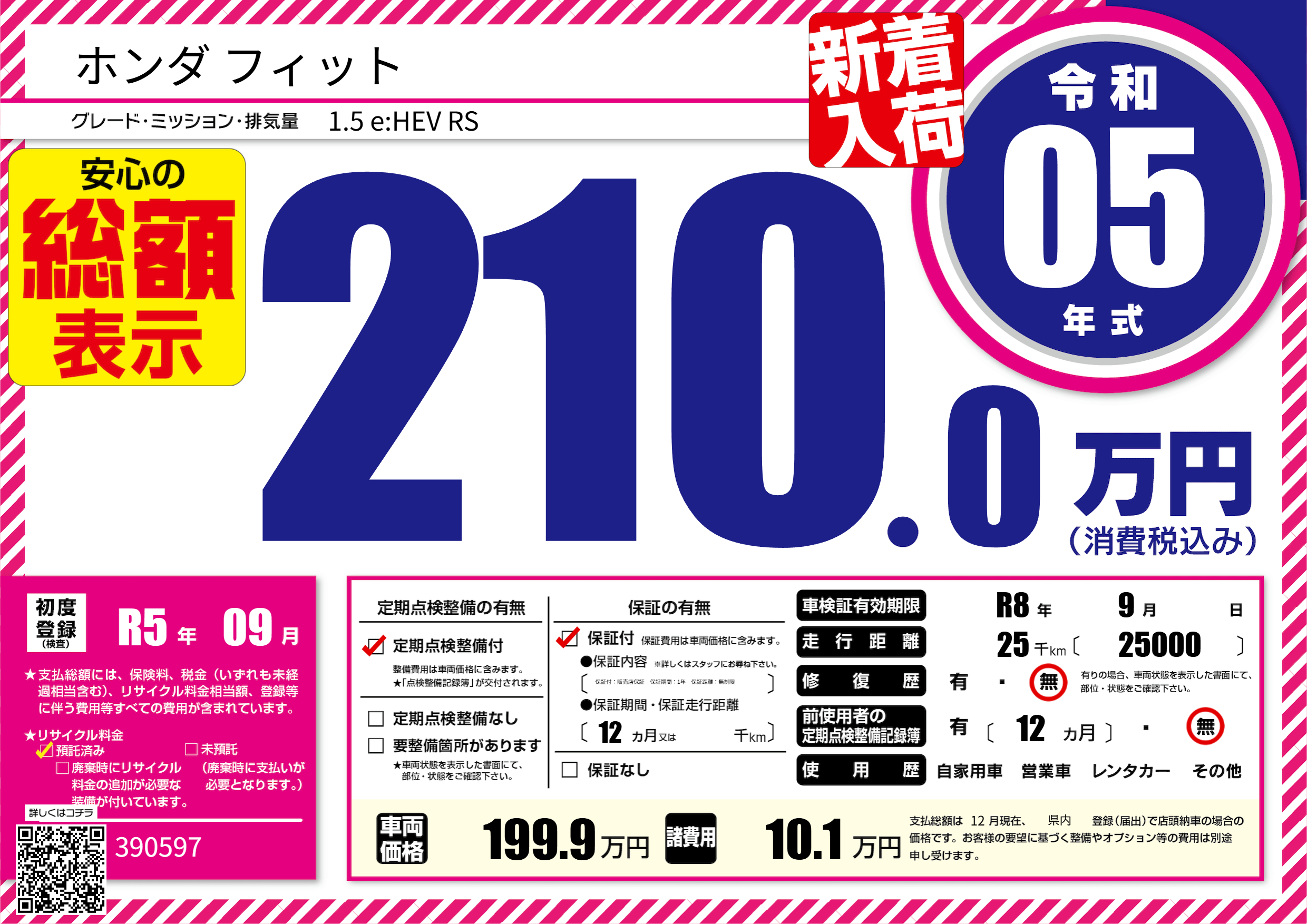 | 走行キロ | 2.5万km | 初年度登録 | R5年09月 |