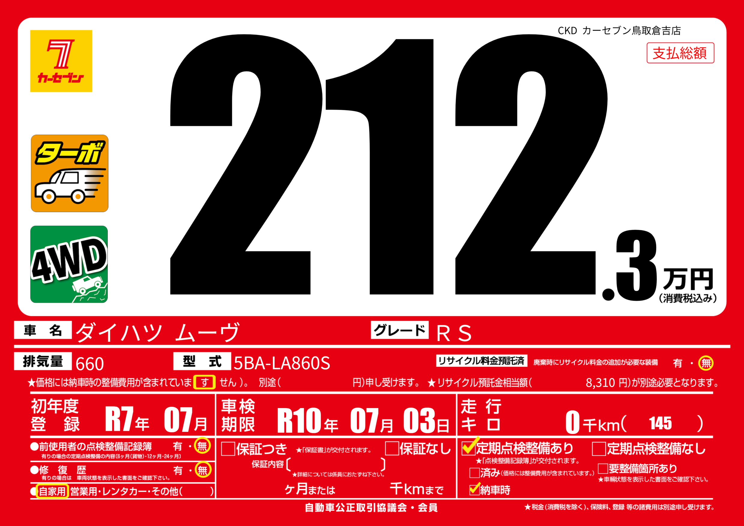 | 走行キロ | - | 初年度登録 | R7年07月 |