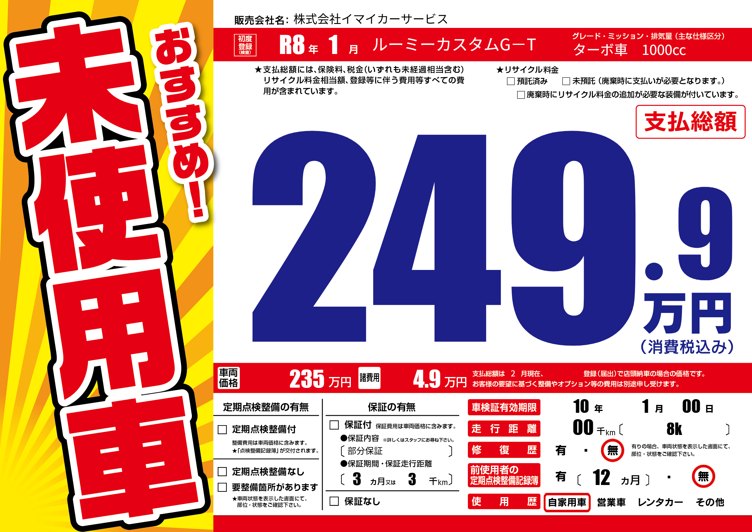 | 走行キロ | - | 初年度登録 | R8年1月 |