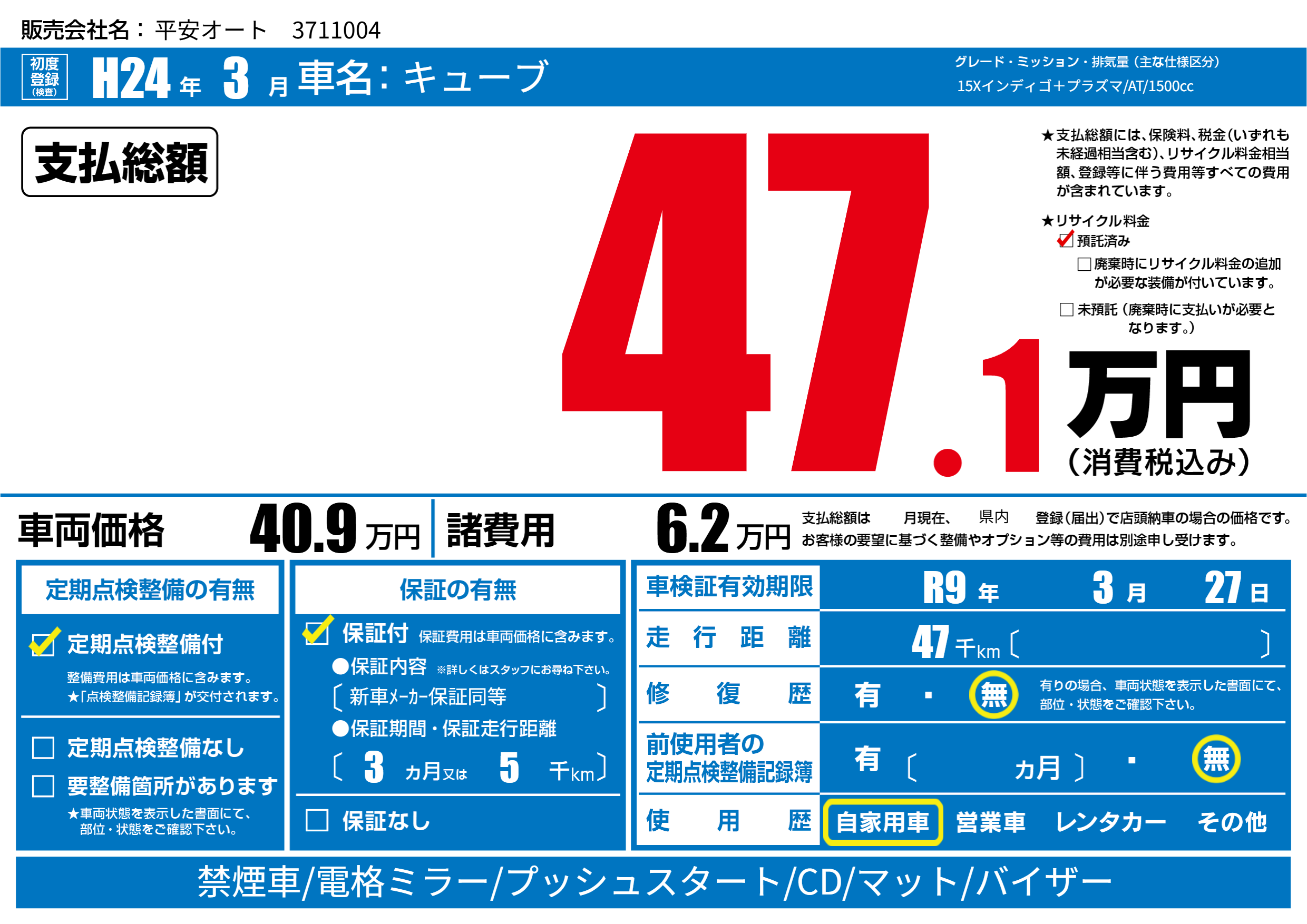 なし | 車検制限 | R9年3月27月 |