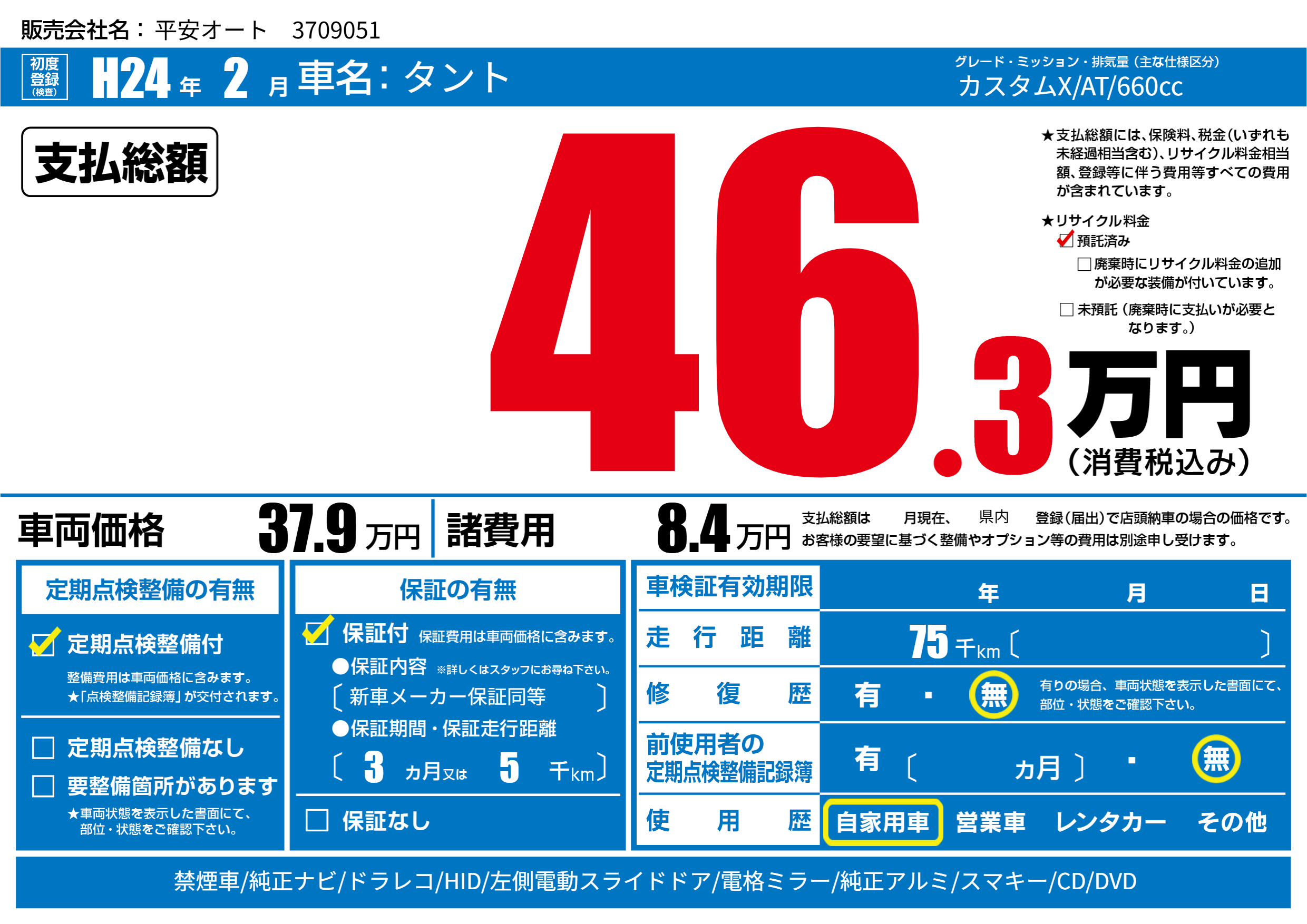 | 走行キロ | 7.5万km | 初年度登録 | H24年2月 |