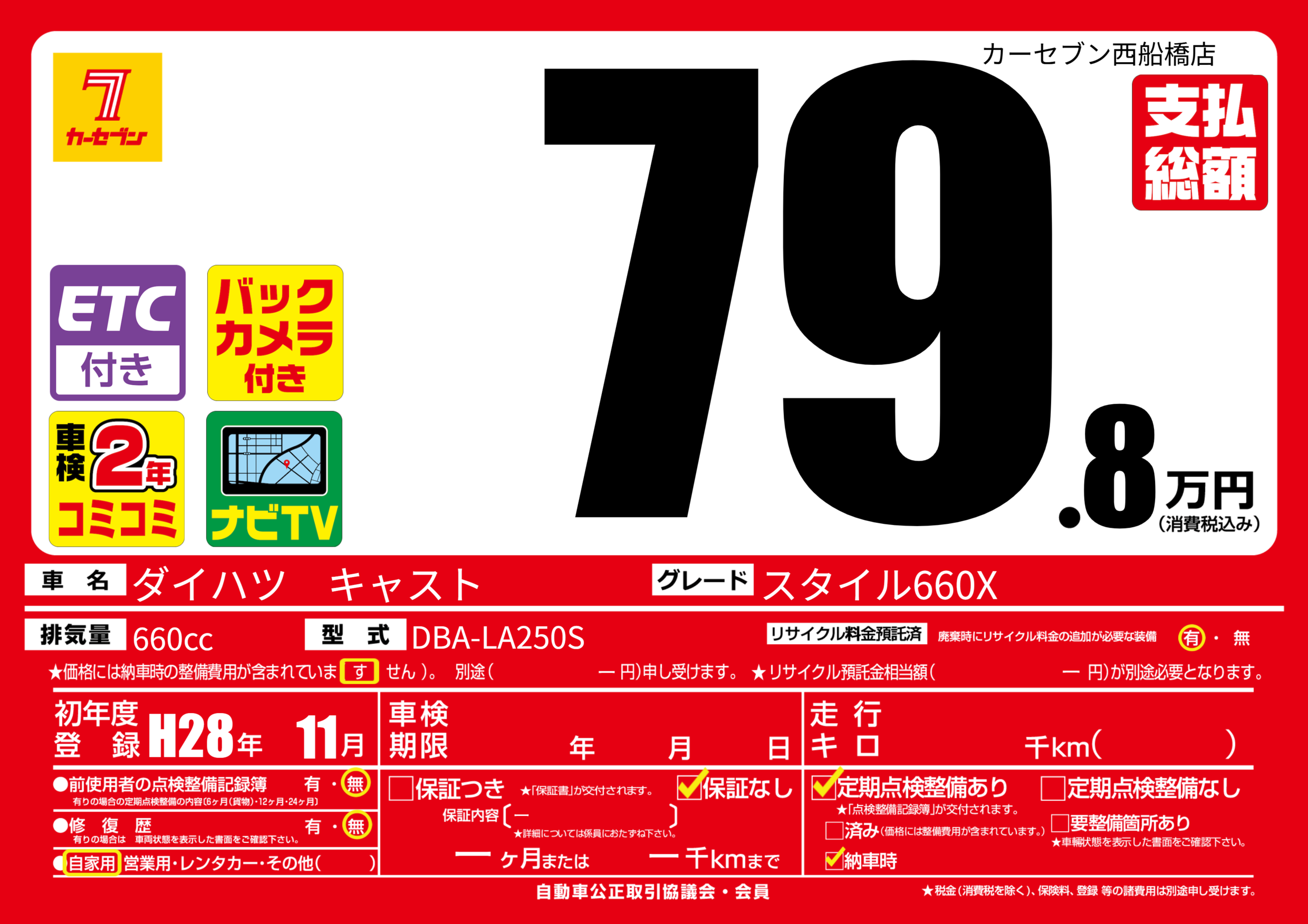 | 定期点検整備 | 定期点検整備あり 納車時あり | ||