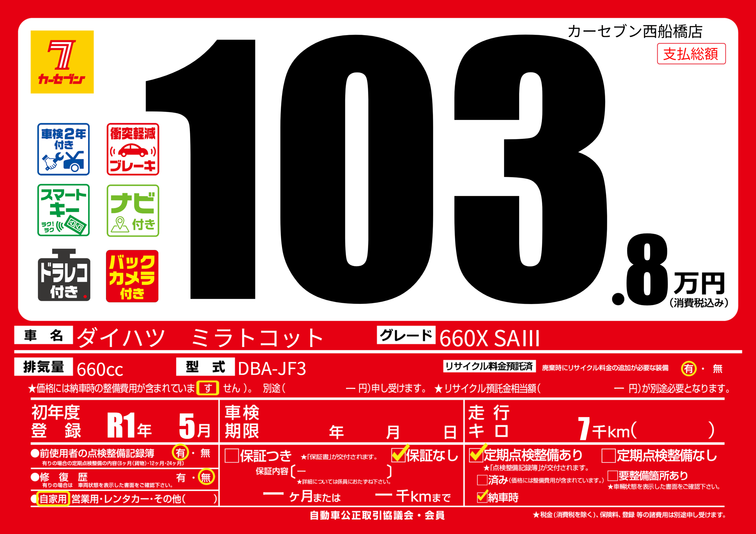 | 走行キロ | 0.7万km | 初年度登録 | R1年5月 |