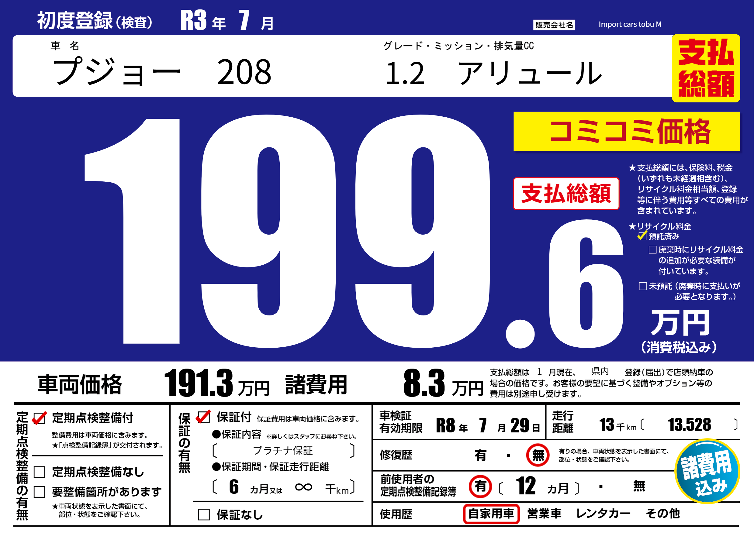 保証付き 保証内容( プラチナ保証) 6ヶ月または(∞)千kmまで |