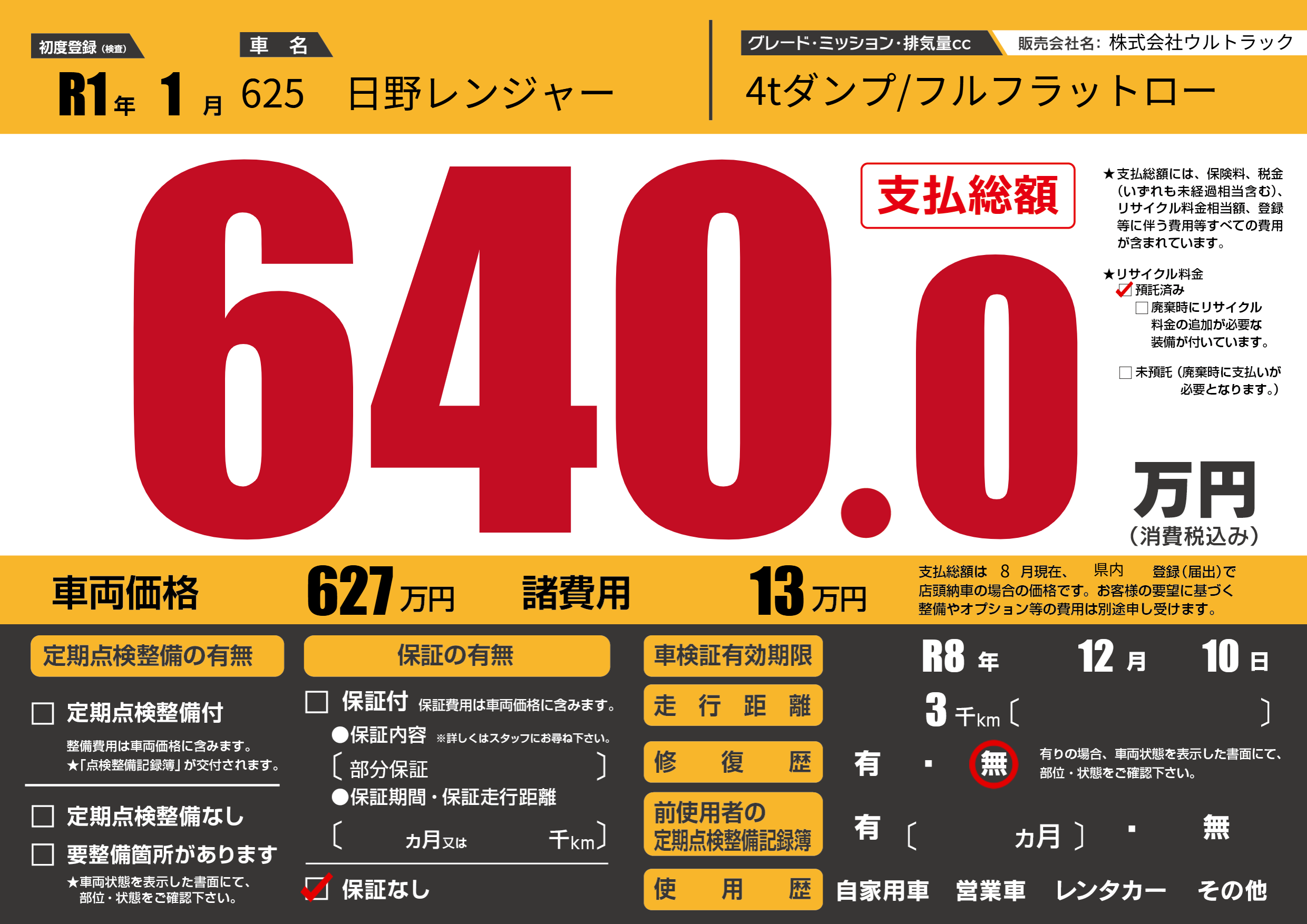 | 車名 | 625 日野レンジャー | グレード ミッション 排気量 |