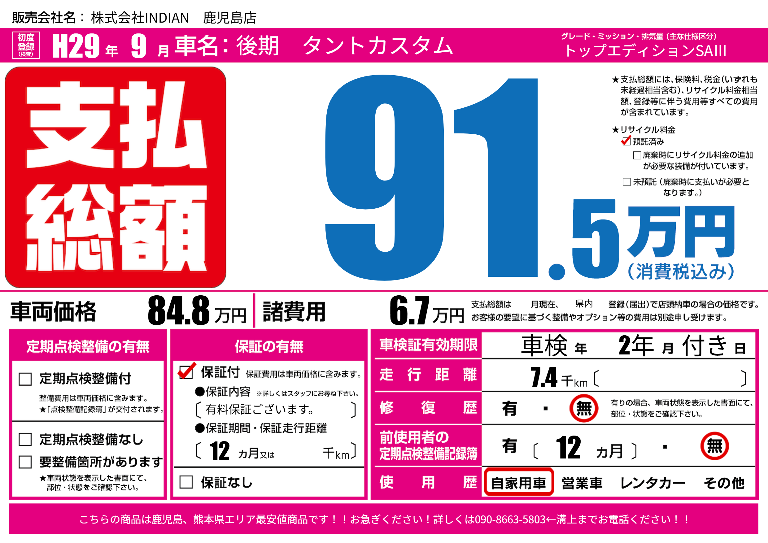 | 走行キロ | 0.7万km | 初年度登録 | H29年9月 |
