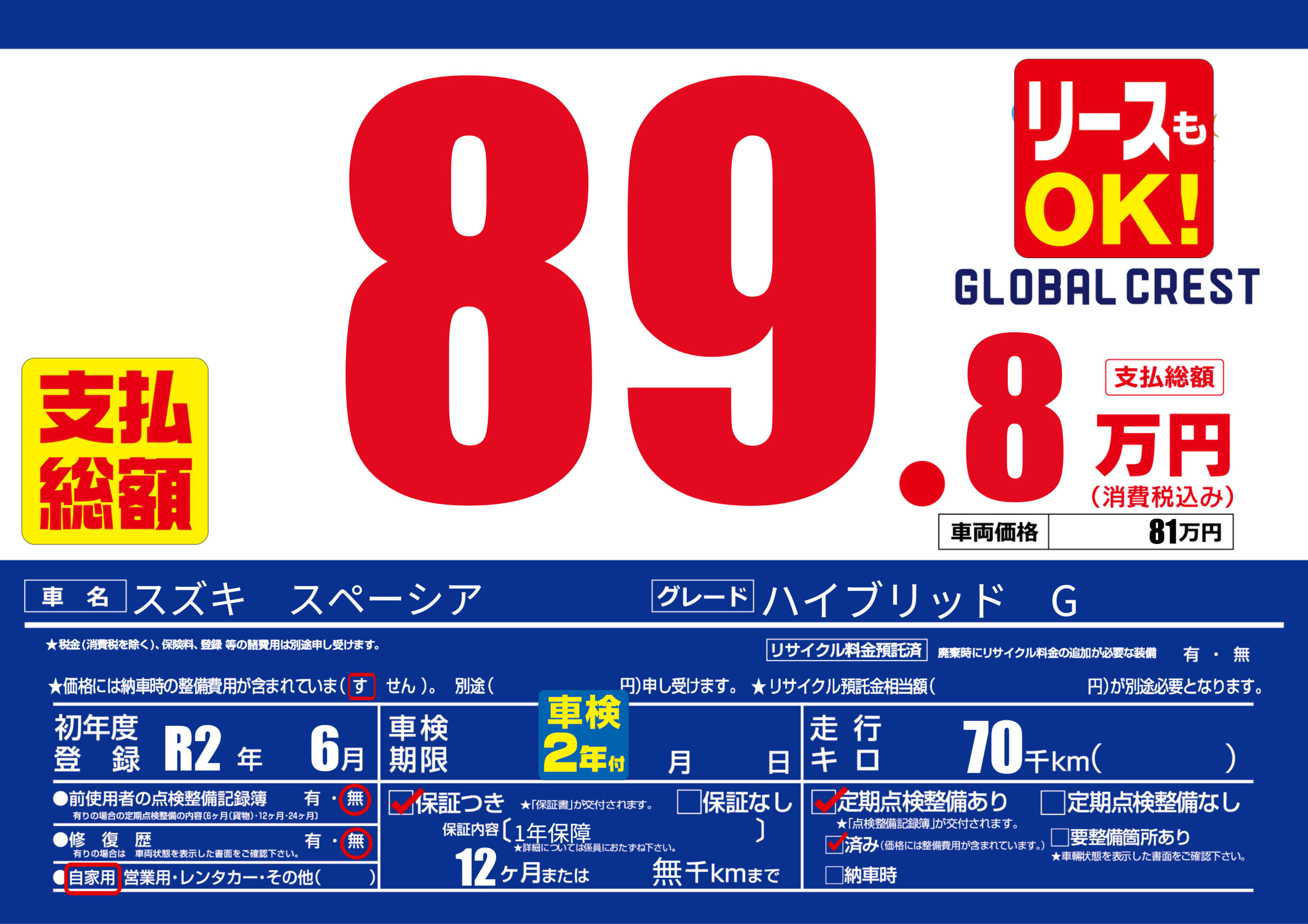 | 定期点検整備 | 定期点検整備あり 定期点検整備済み | ||