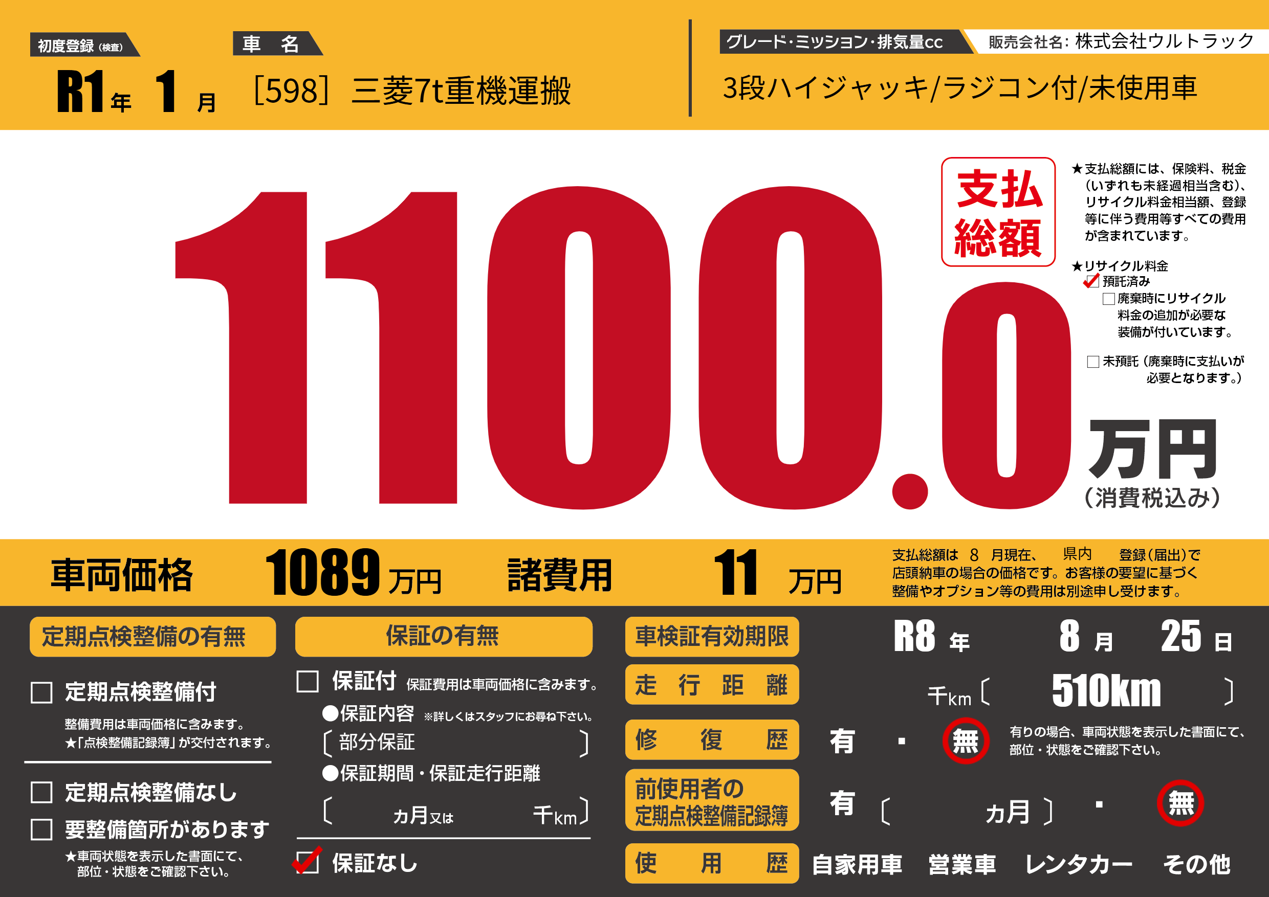 | 車名 | [598]三菱7t重機運搬 | グレード ミッション 排気量 |