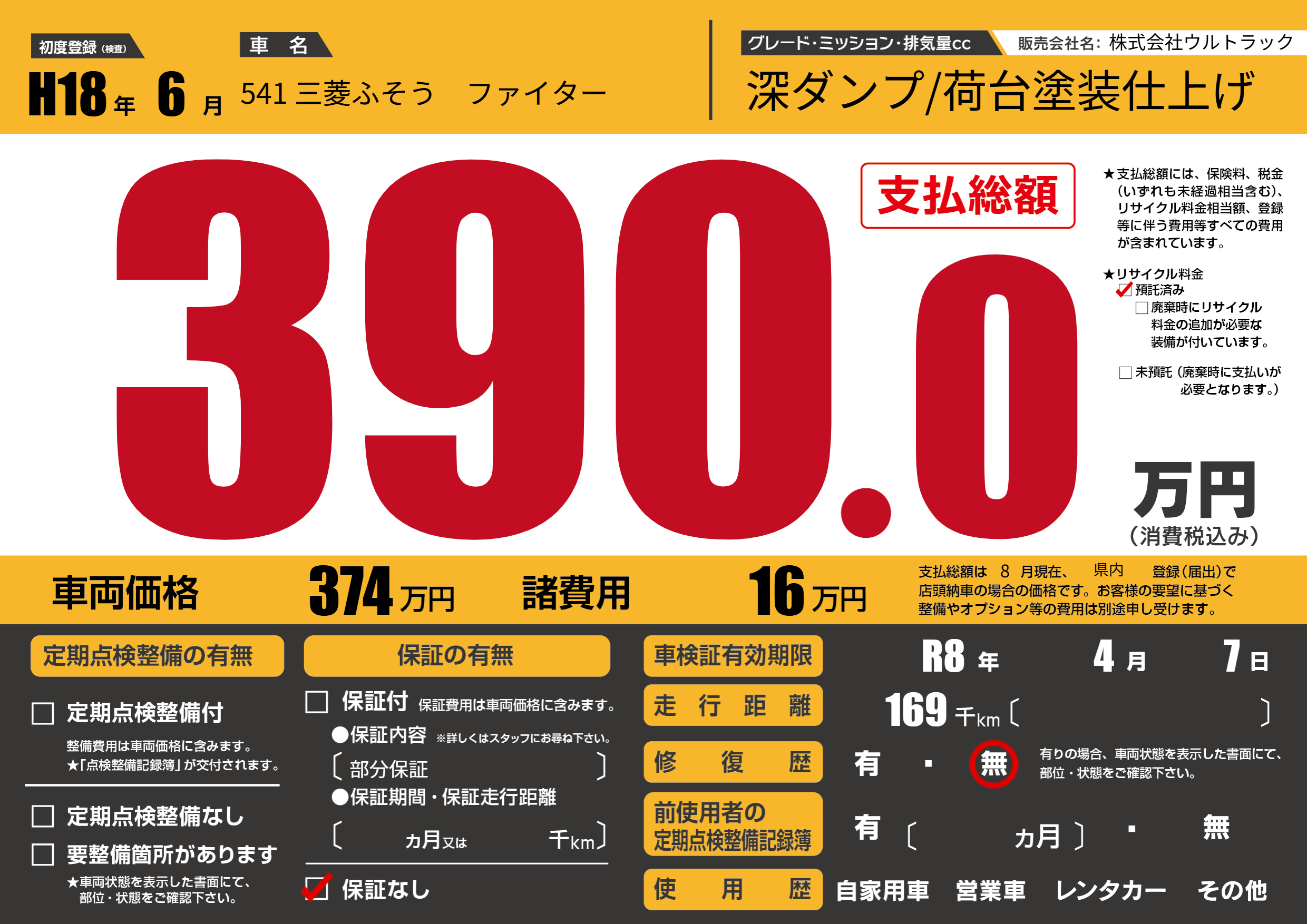 | 走行キロ | 16.9万km | 初年度登録 | H18年6月 |