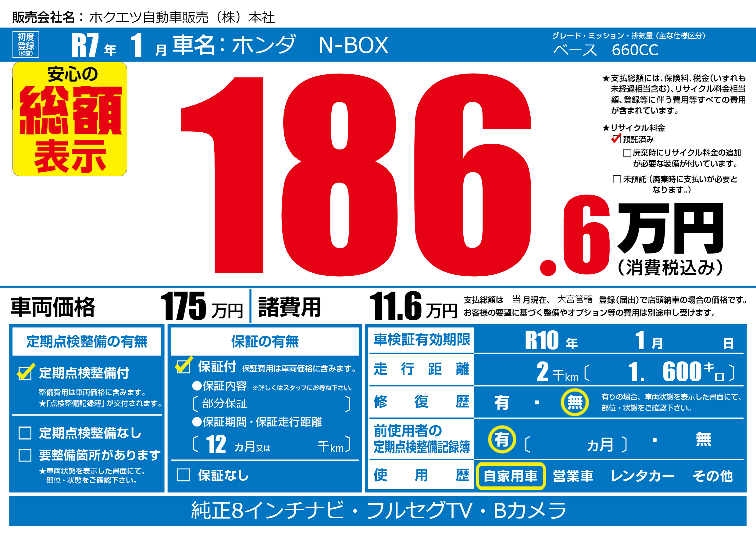 | 車検制限 | R10年 1月 - 日 | ||