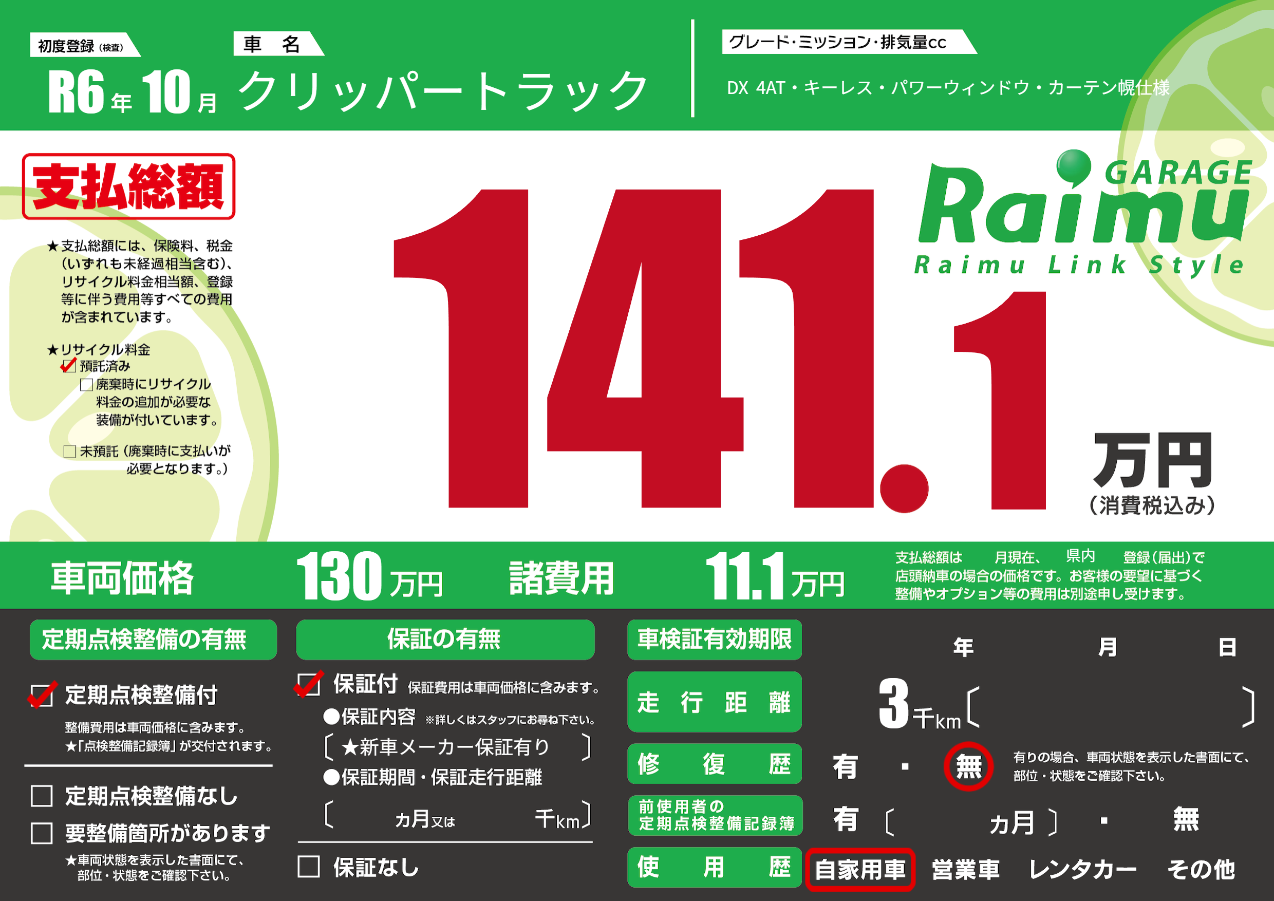 | 走行キロ | 0.3万km | 初年度登録 | R6年10月 |