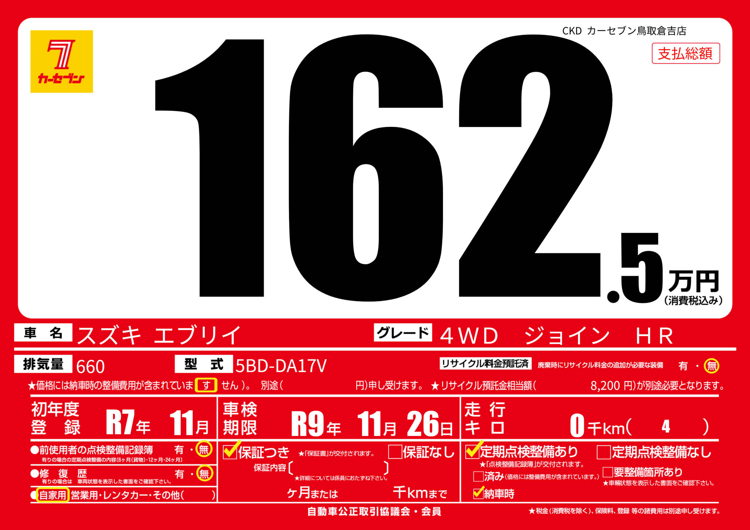 | 走行キロ | - | 初年度登録 | R7年11月 |
