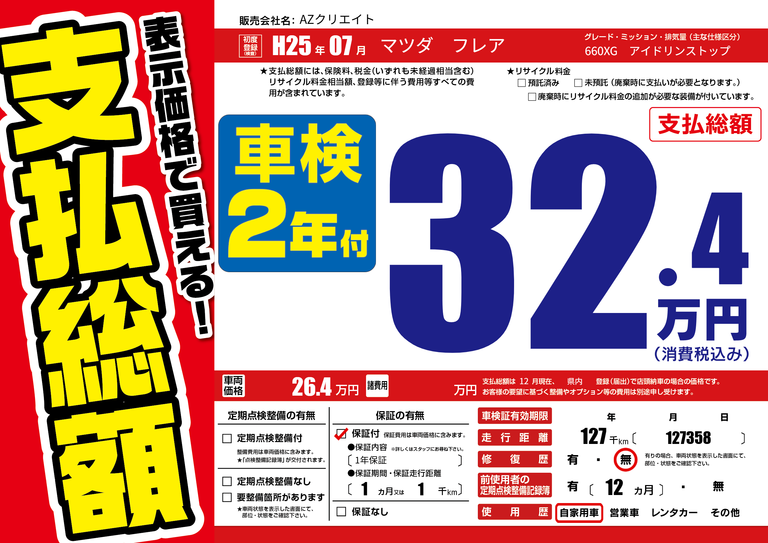 | 走行キロ | 12.7万km | 初年度登録 | H25年07月 |
