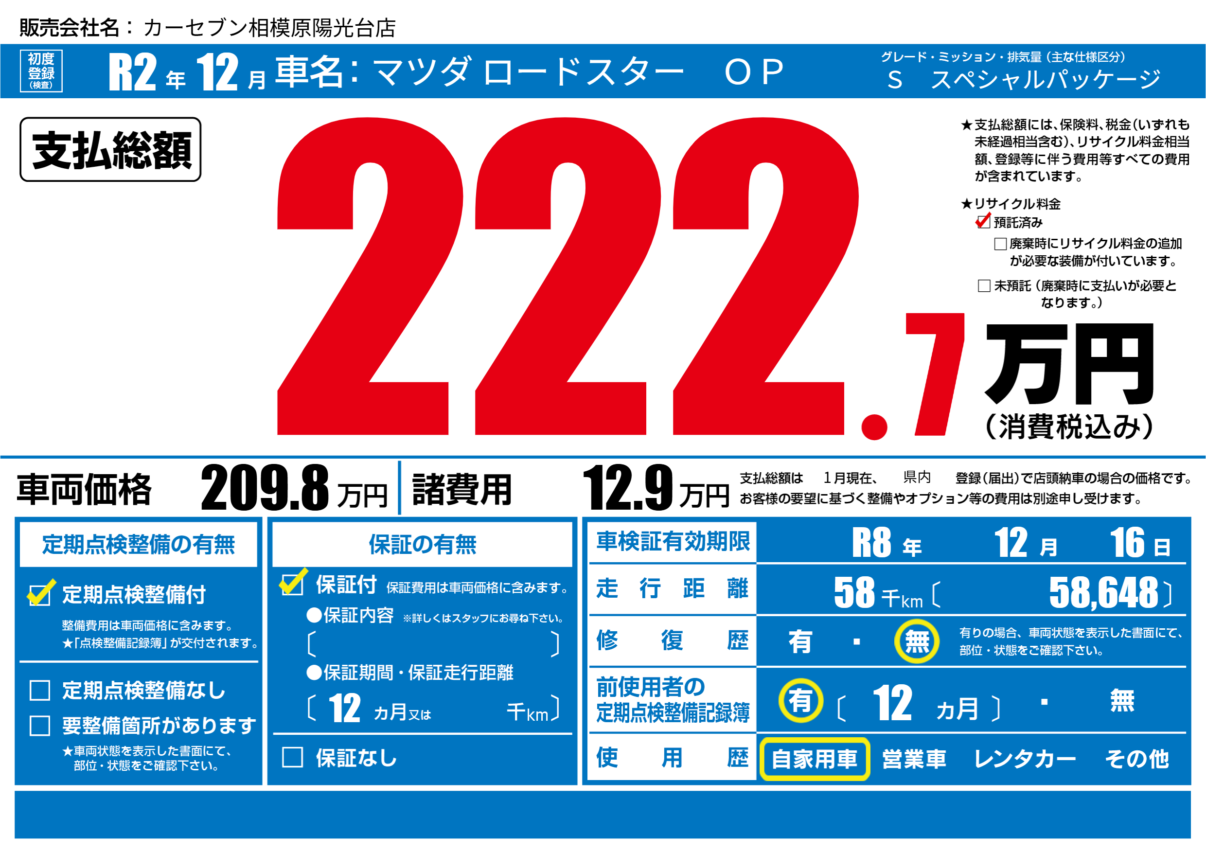 | 車名 | マツダ ロードスター OP | グレード ミッション 排気量 |