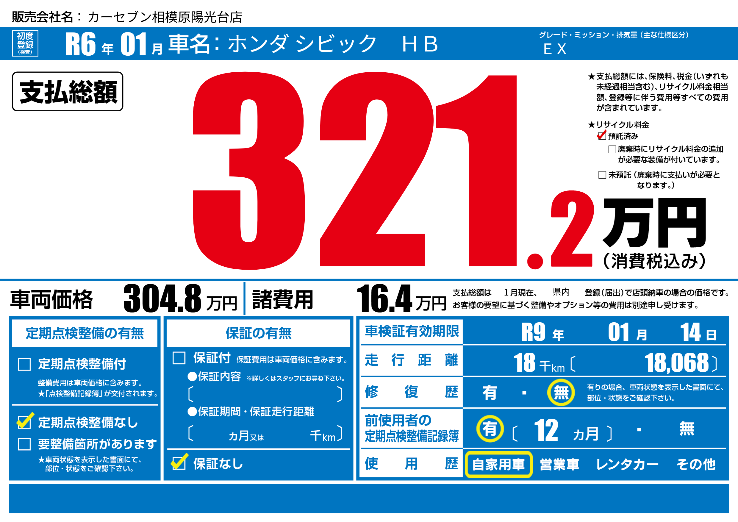 | 車名 | ホンダ シビック HB | グレード ミッション 排気量 |