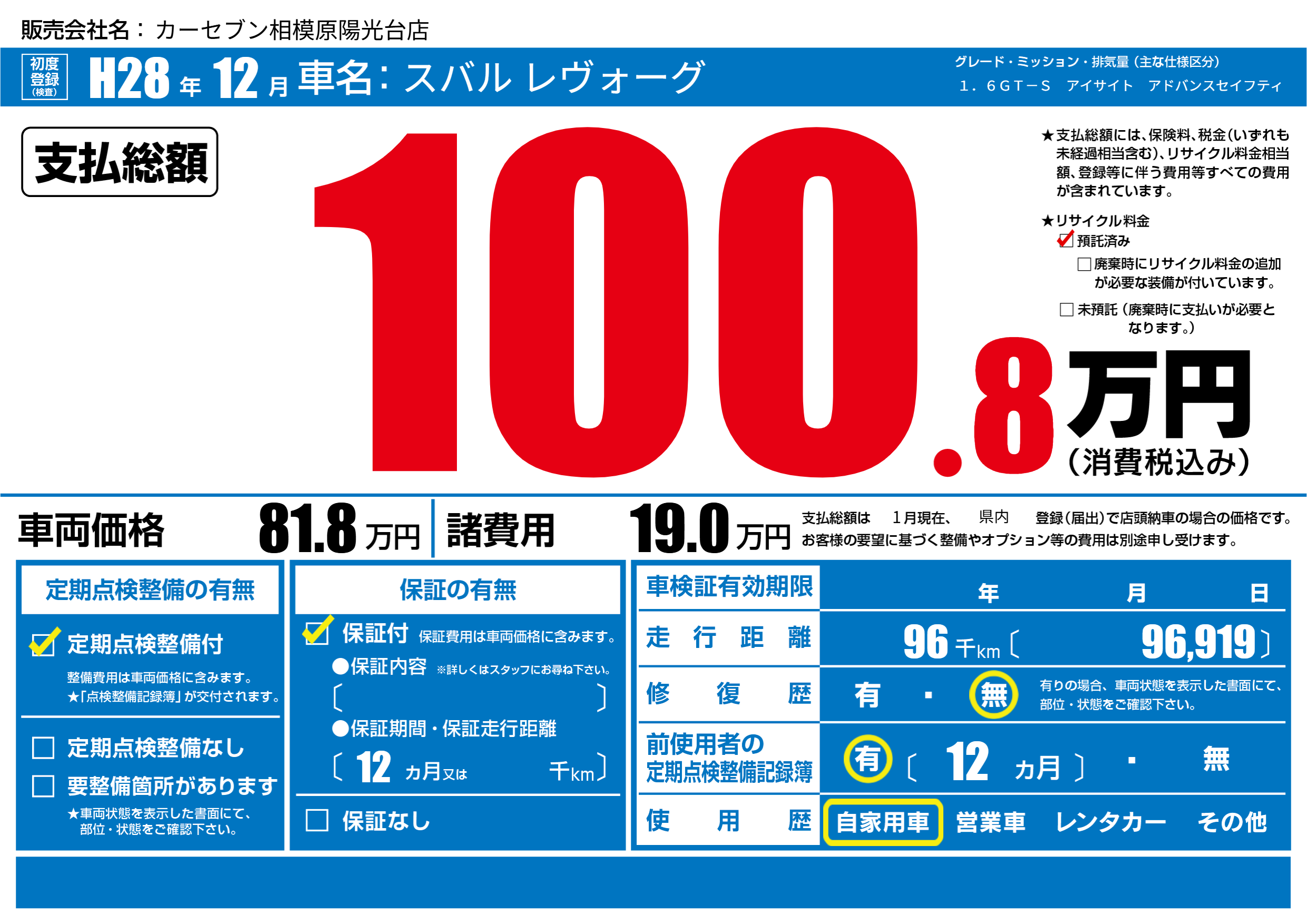 | 車名 | スバル レヴォーグ | グレード ミッション 排気量 |