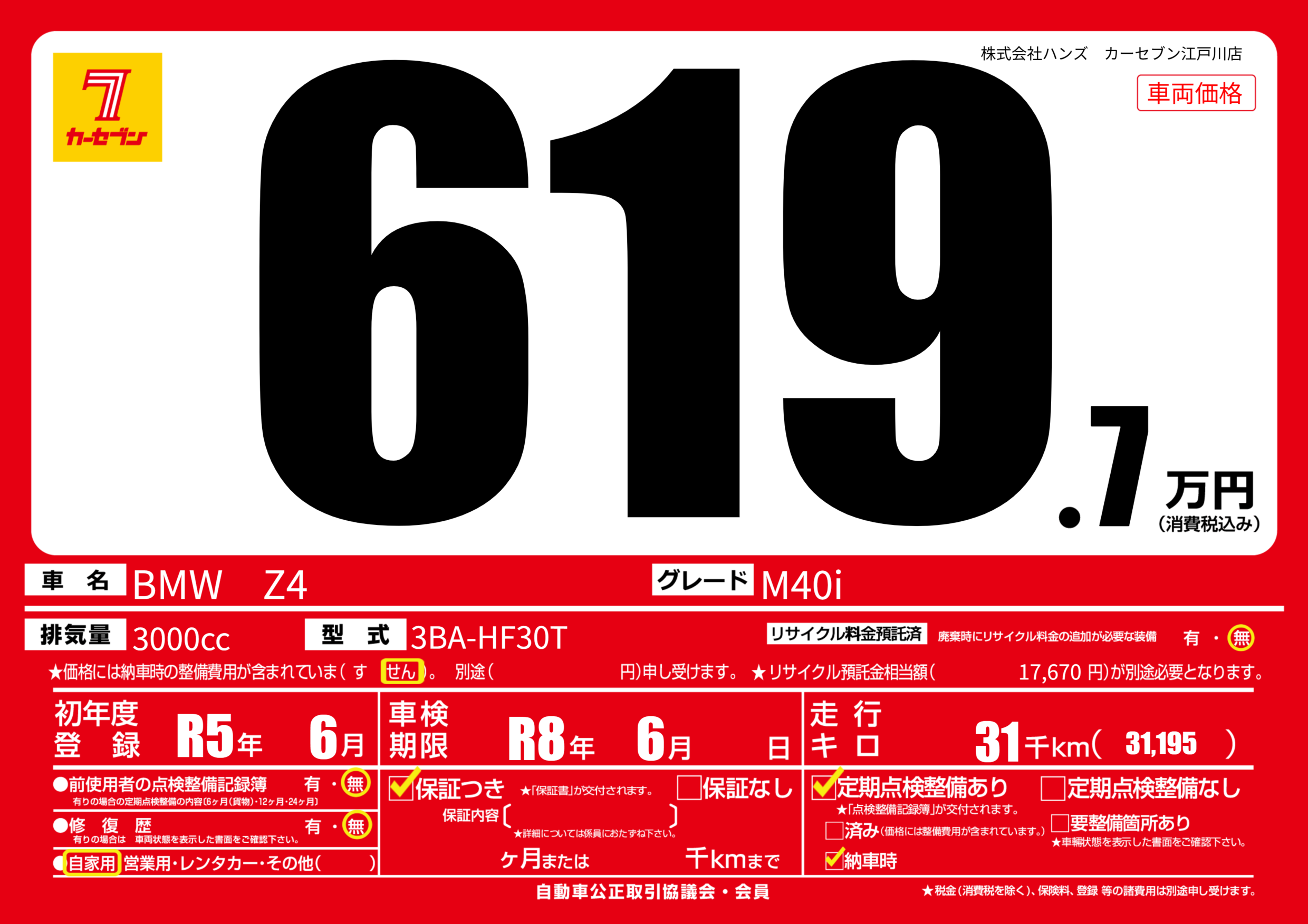 | 車名 | BMW Z4 | グレード ミッション 排気量 |