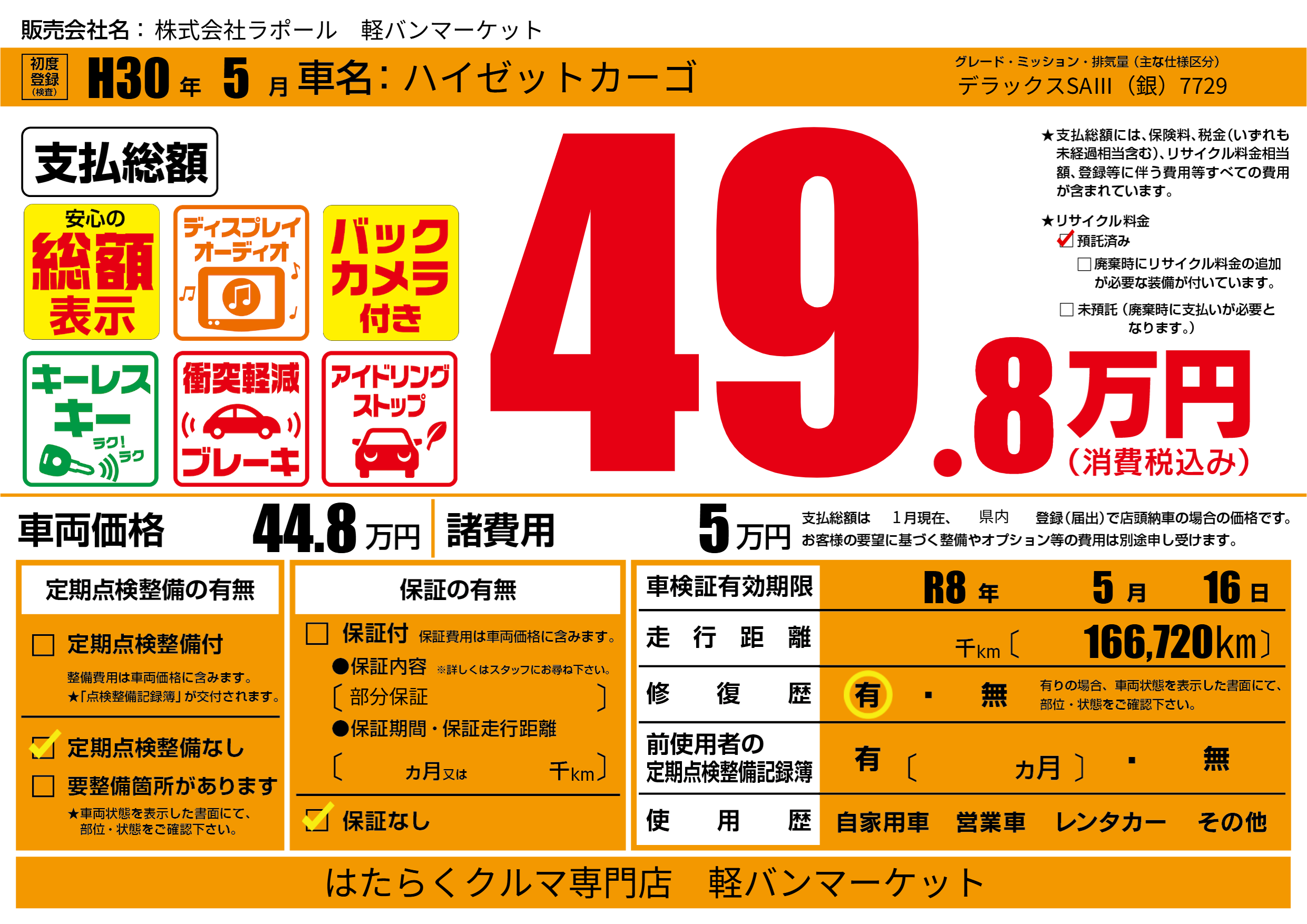 | 走行キロ | - | 初年度登録 | H30年5月 |