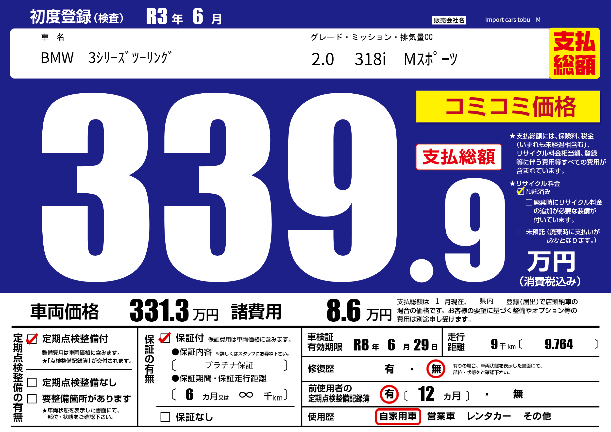 | 車名 | BMW 3シリーズツーリング | グレード ミッション 排気量 |