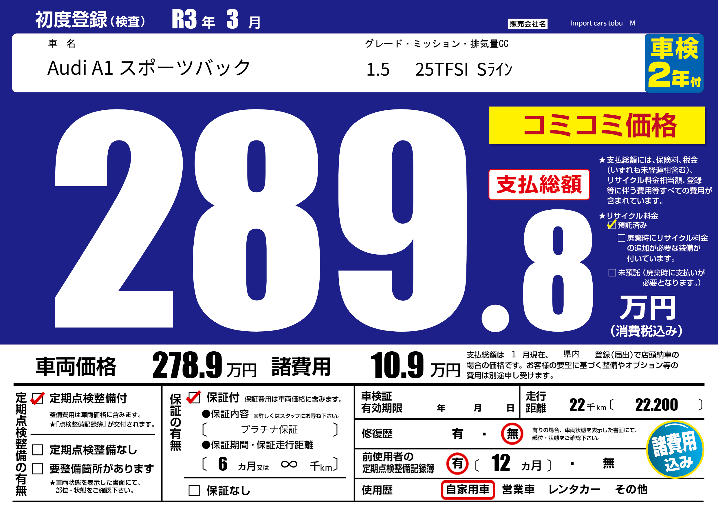 | 車名 | Audi A1 スポーツバック | グレード ミッション 排気量 |