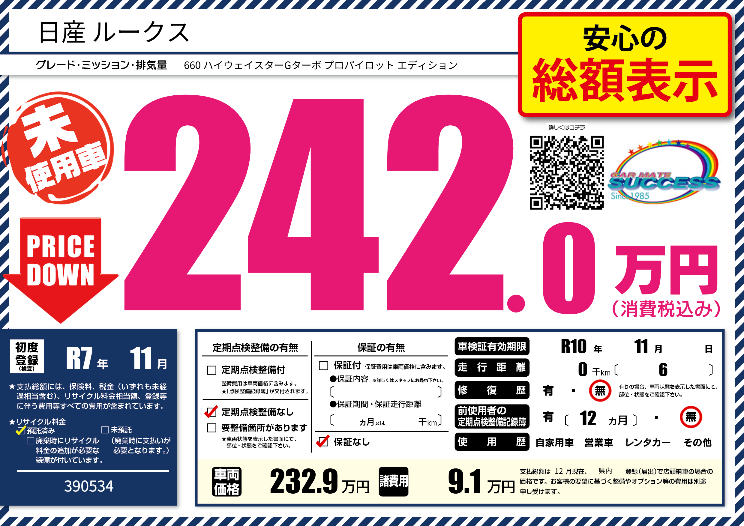| 車名 | 日産 ルークス | グレード ミッション 排気量 |