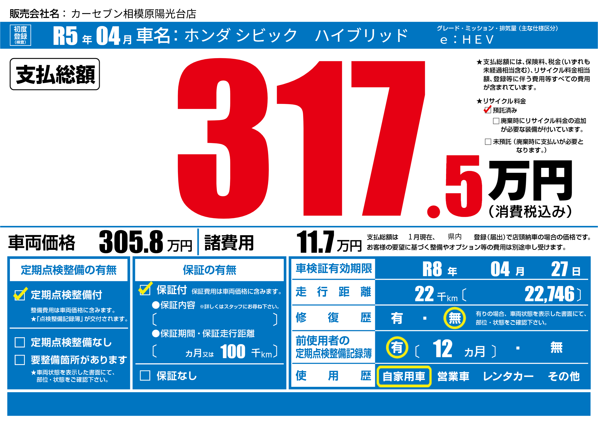 | 走行キロ | 2.2万km | 初年度登録 | R5年04月 |