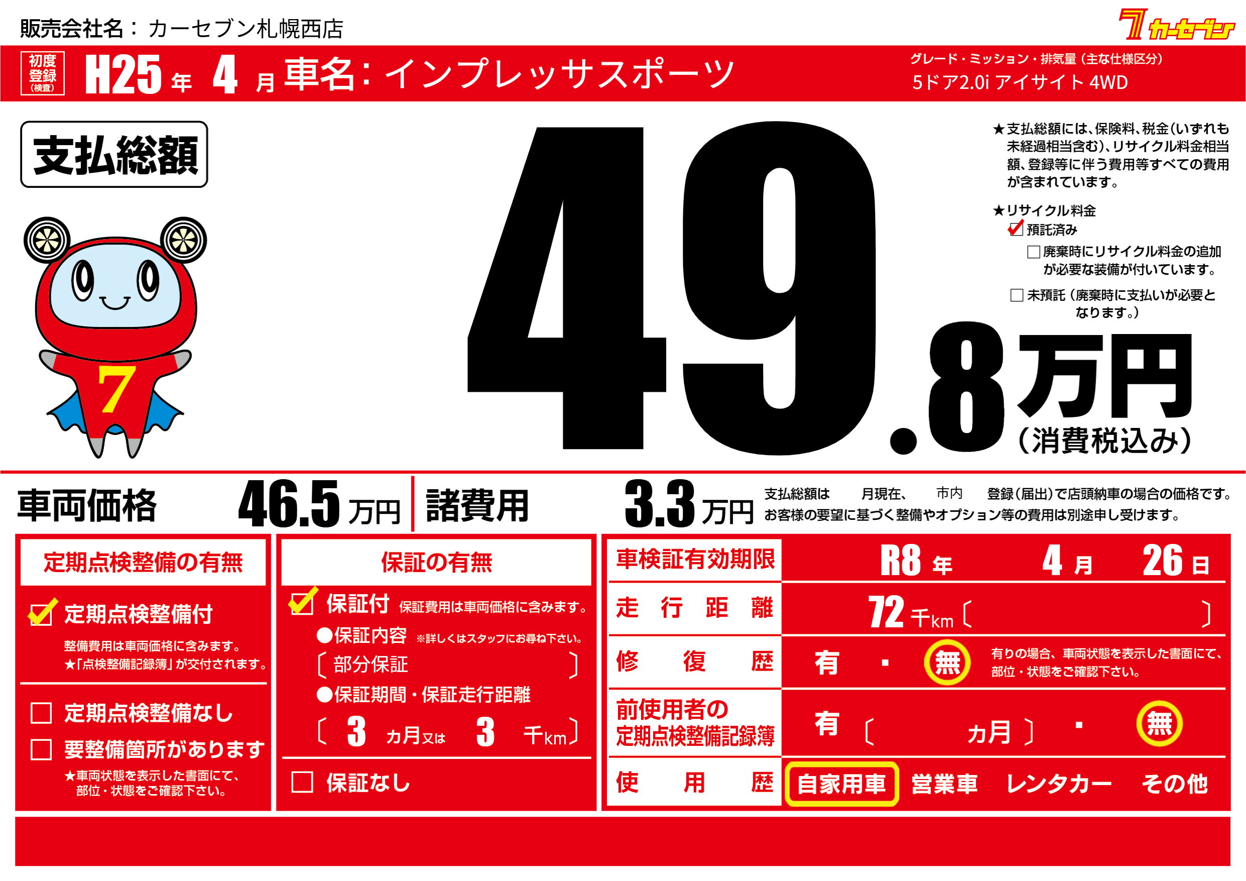 なし | 車検制限 | R8年4月26月 |