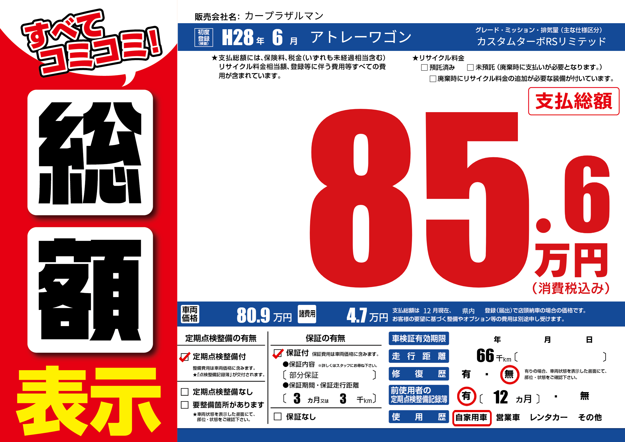 | 走行キロ | 6.6万km | 初年度登録 | H28年6月 |
