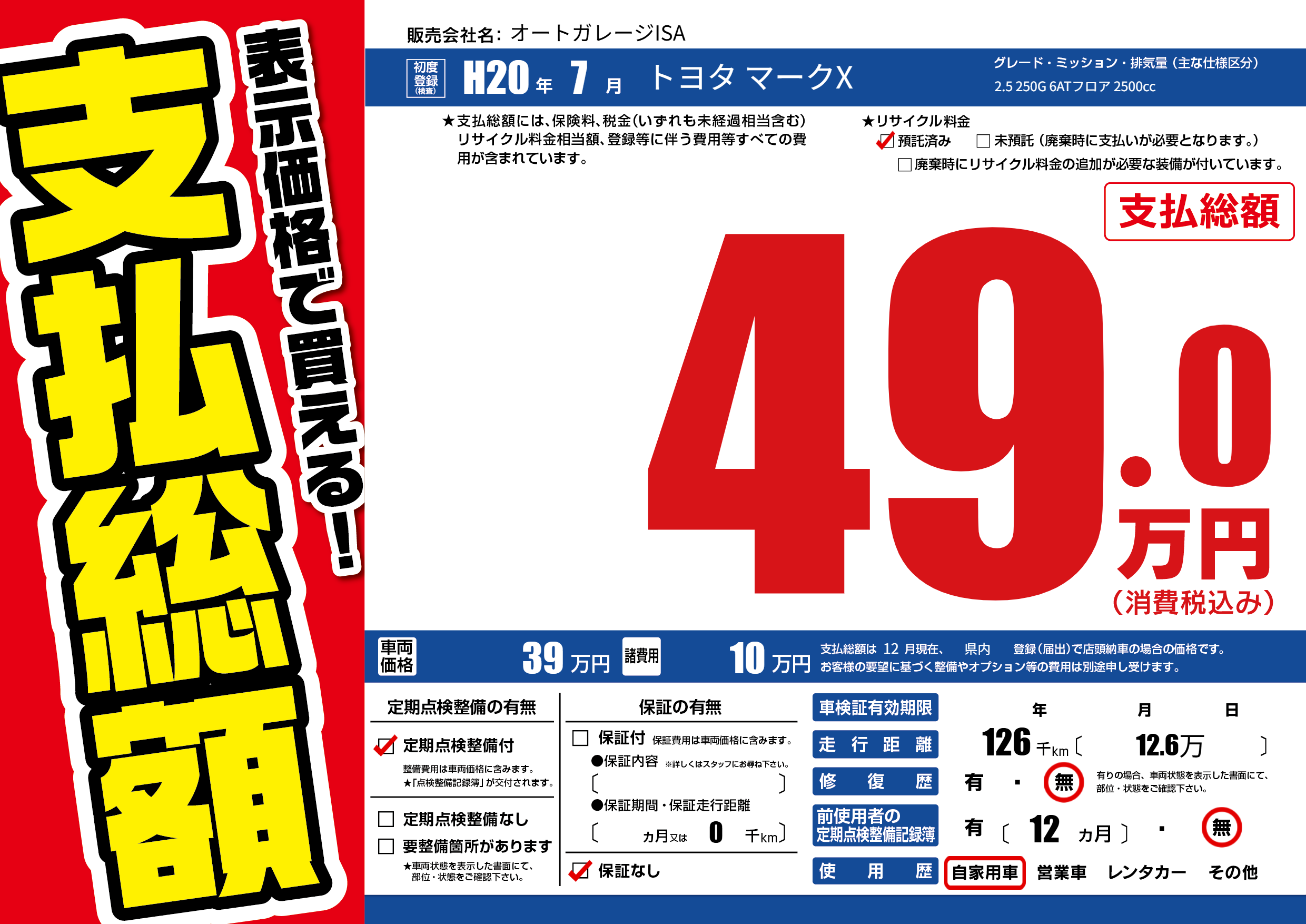 | 走行キロ | 12.6万km | 初年度登録 | H20年7月 |