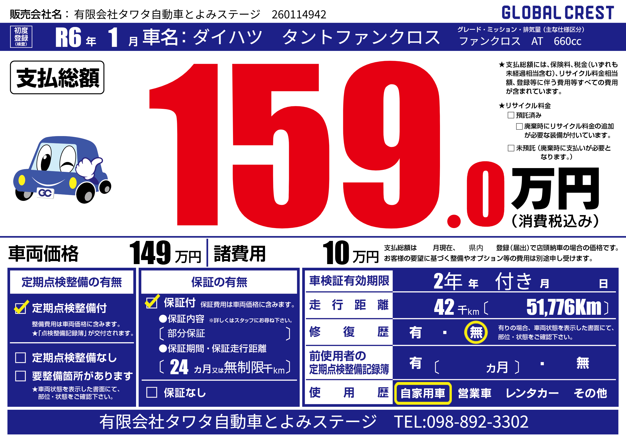 | 車名 | ダイハツ タントファンクロス | グレード ミッション 排気量 |